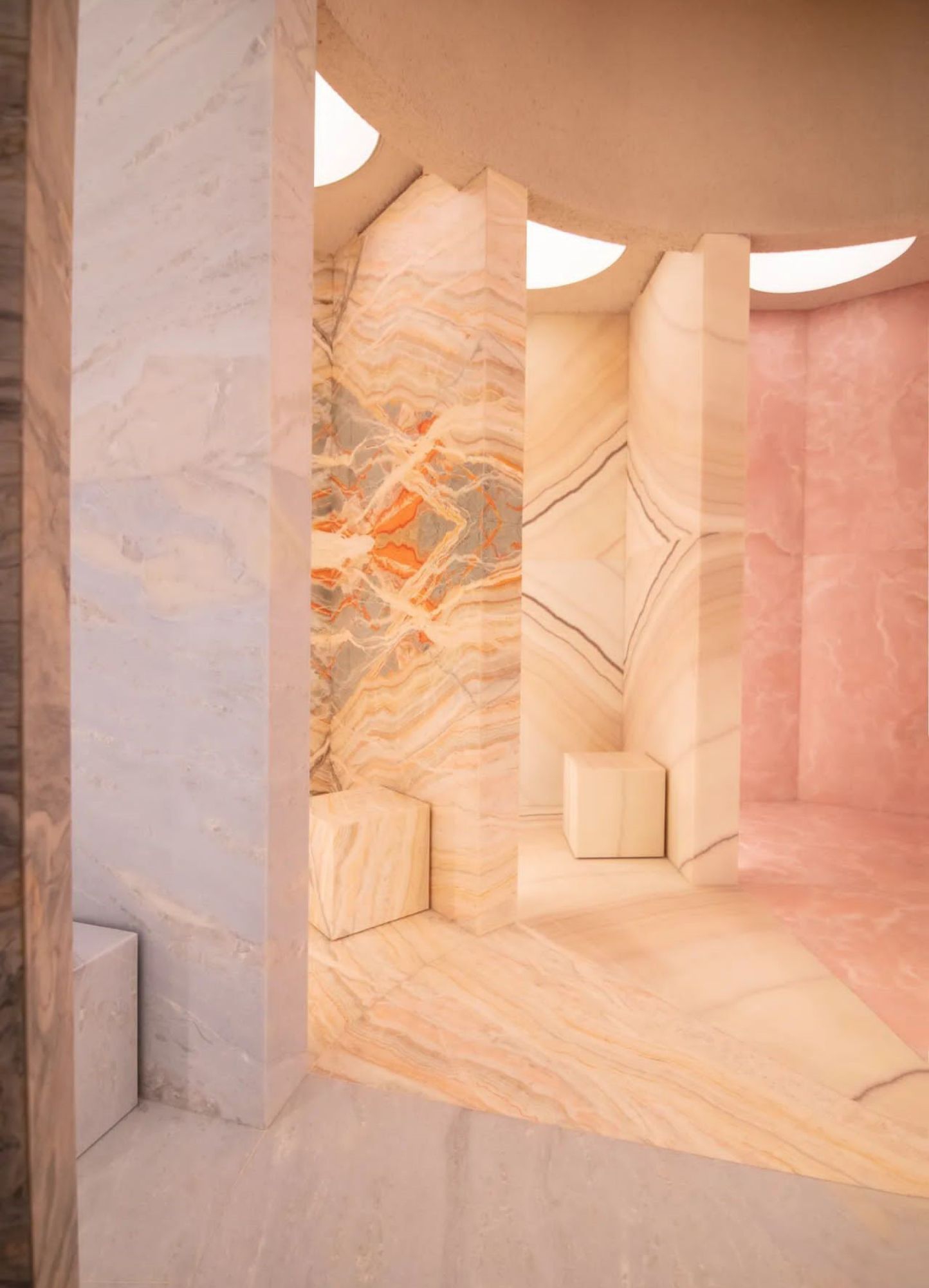 inside the fitting rooms, large mirrors almost two and a half metres high were illuminated with 13°angolo custom-made to be recessed into the marble walls, thus creating lighting appropriate to the space without detracting from the peculiarities of the architecture and materials.