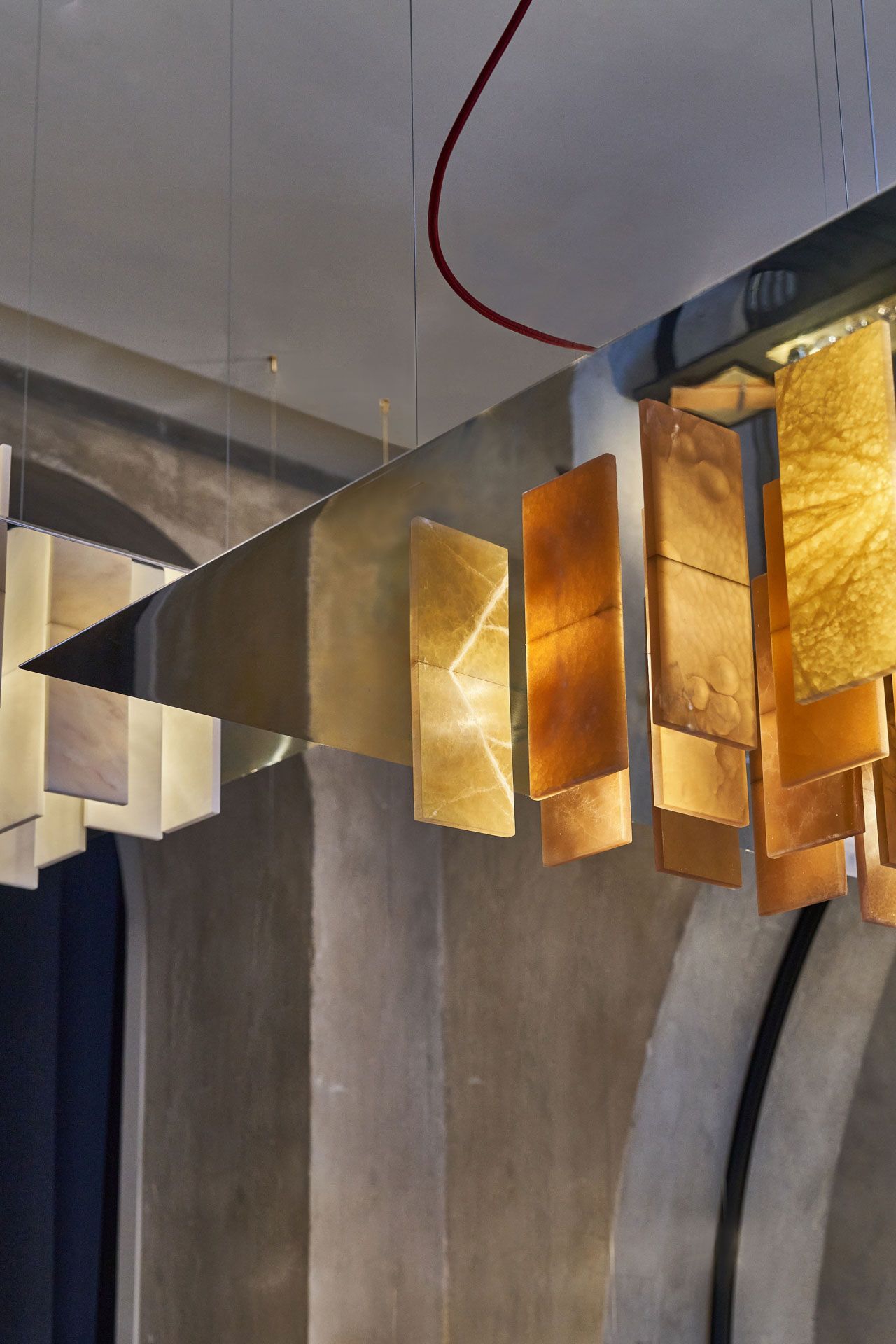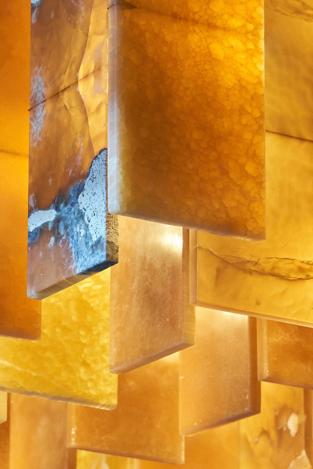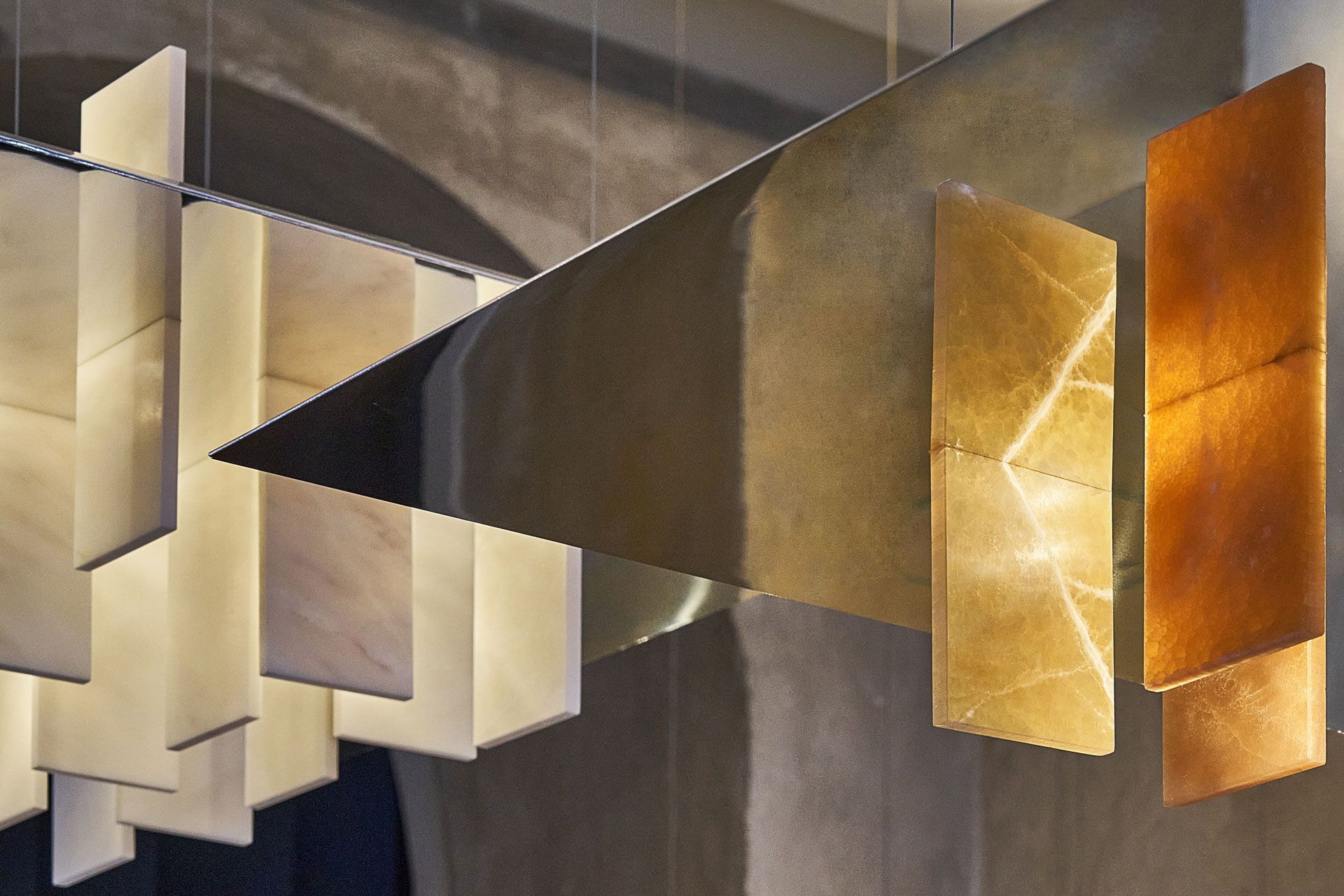 made of polished aluminium and onyx and polished aluminium and pink marble.