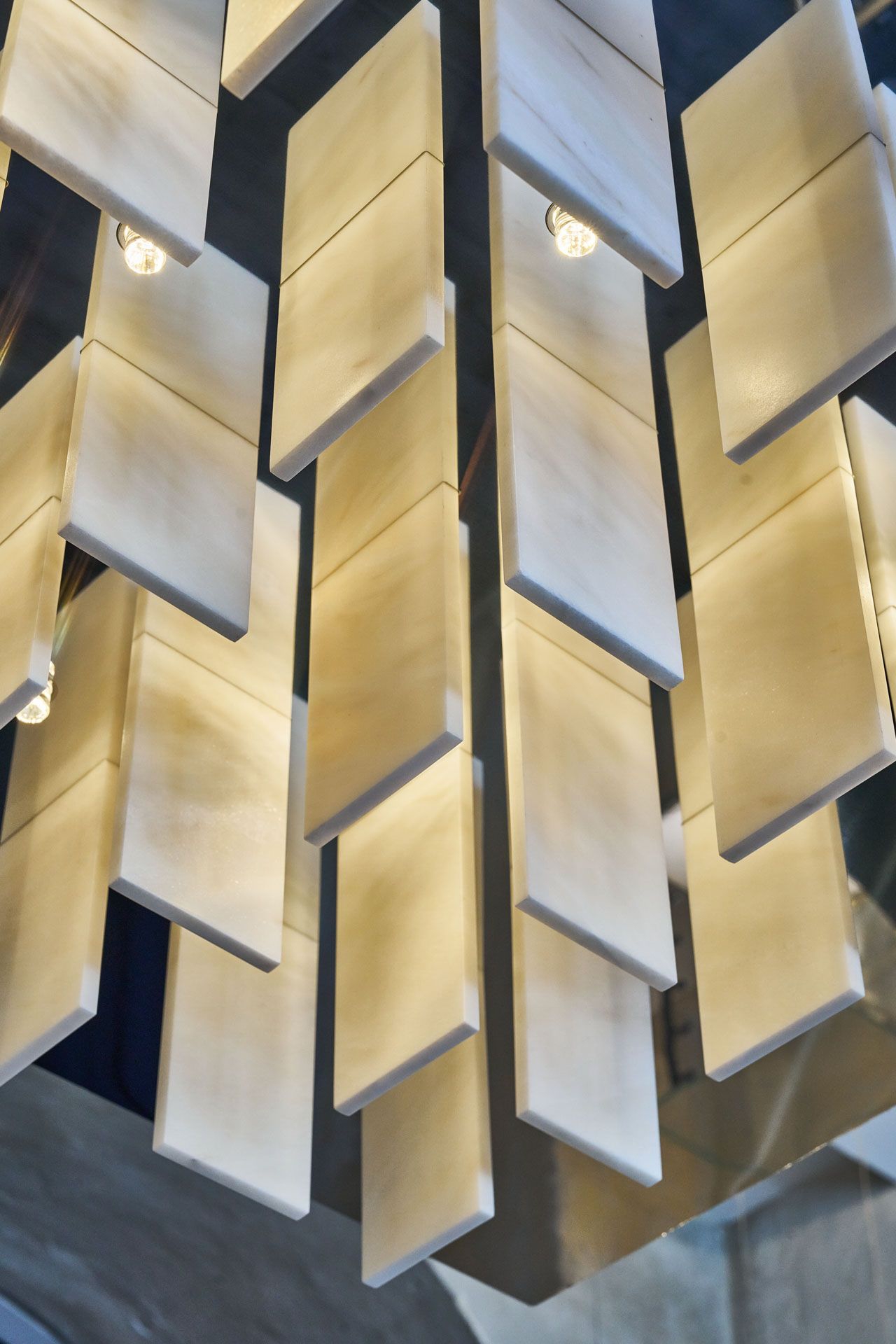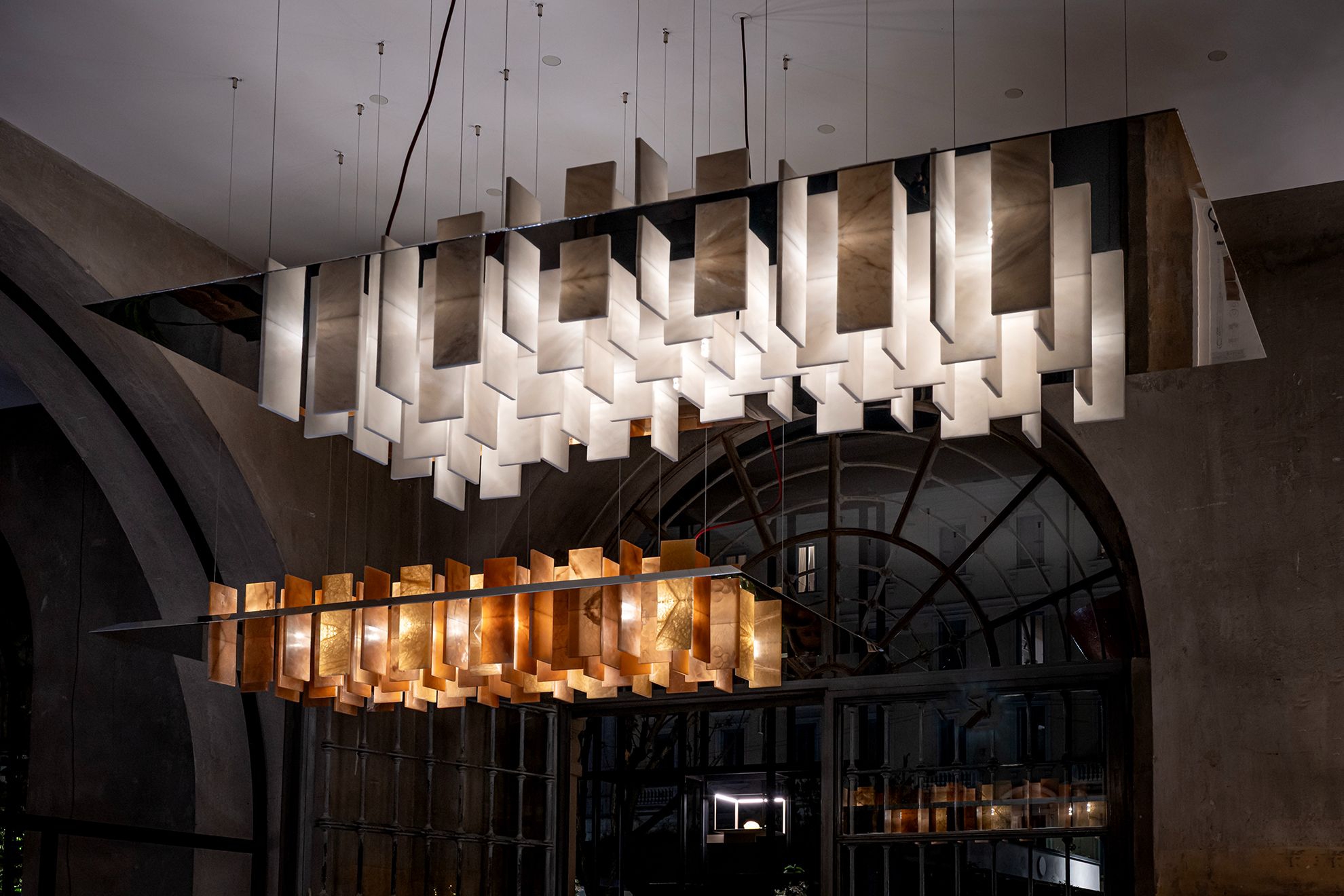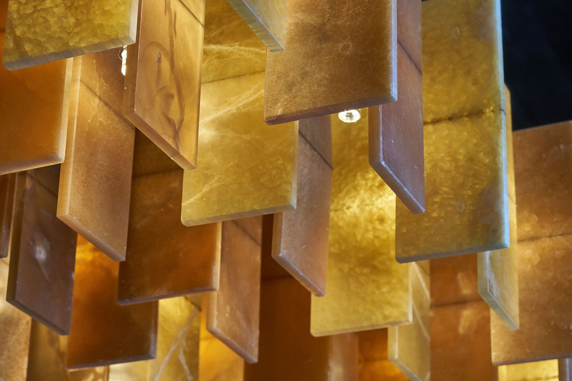 made of polished aluminium and onyx and polished aluminium and pink marble.