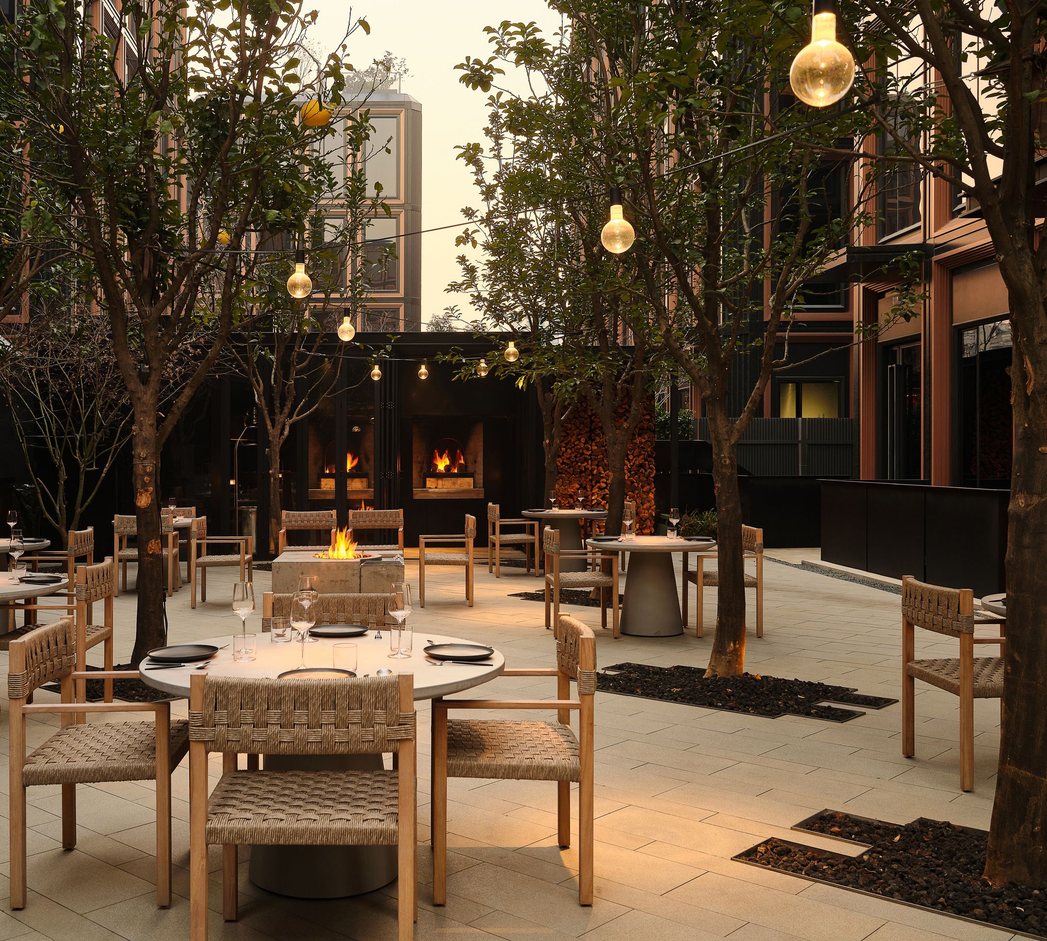 il giardino richiama le forme dell'agrumeto mediterraneo, immerso in un'atmosfera romantica e sognante. tra i rigogliosi cedri locali, catenarie di luce serpentine creano vivaci percorsi di luce tra i tavoli.