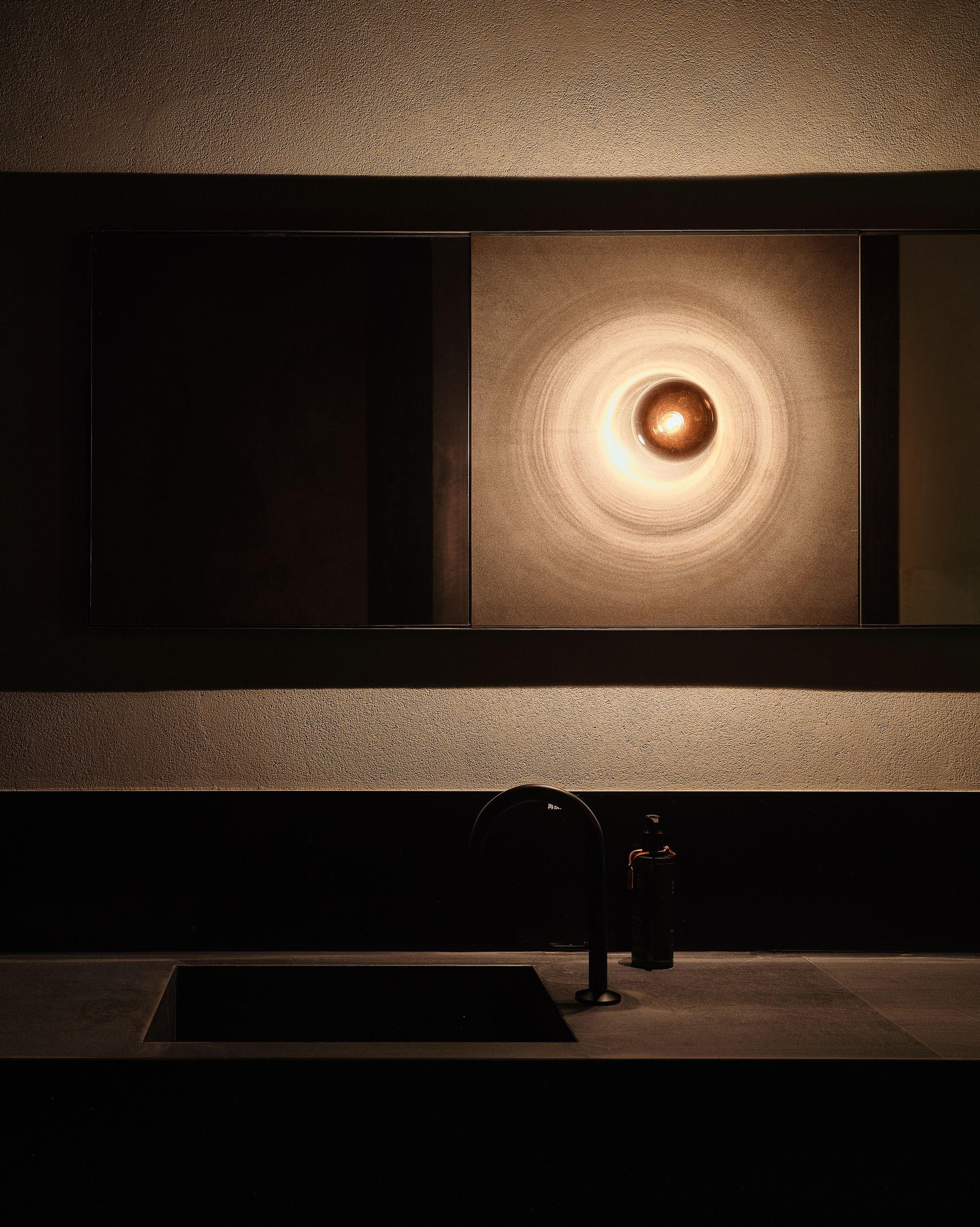 al piano inferiore, dove si trova il bar, n55 soffitto con lensoptica illumina delicatamente lo spazio, accarezzando appena i raffinati arredi e le preziose opere d'arte. a lato del bar, su un grande tavolo dedicato alla convivialità, spingi qua si nasconde nello spessore del piano grazie al sistema a pressione e offre la sua luce agli ospiti solo quando serve.