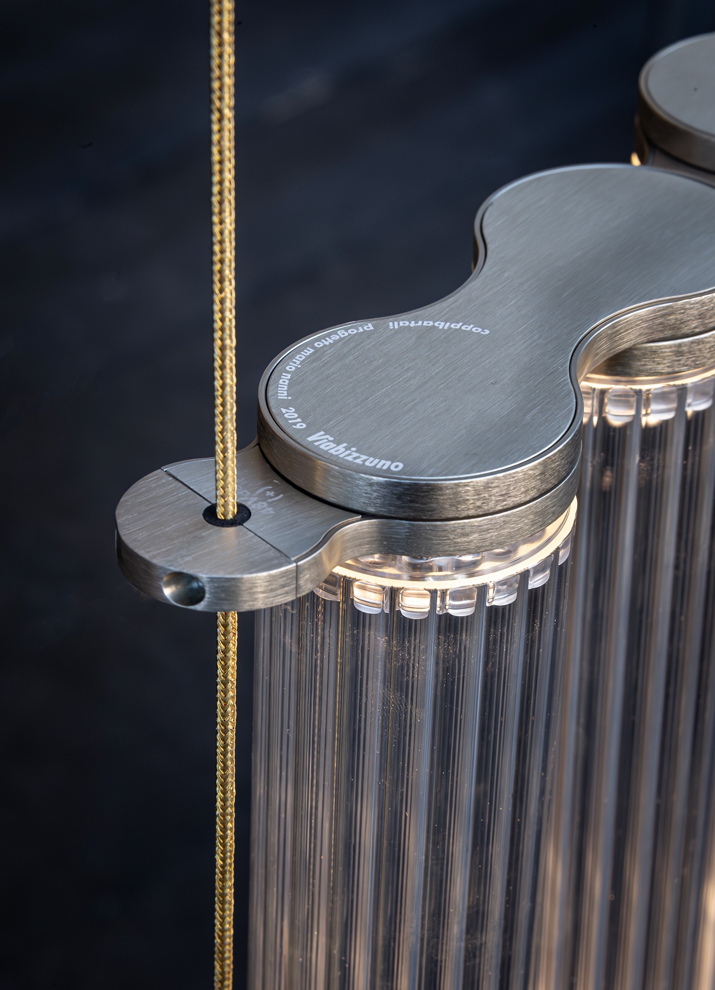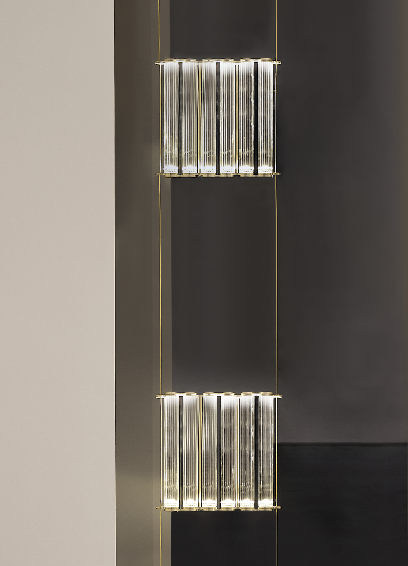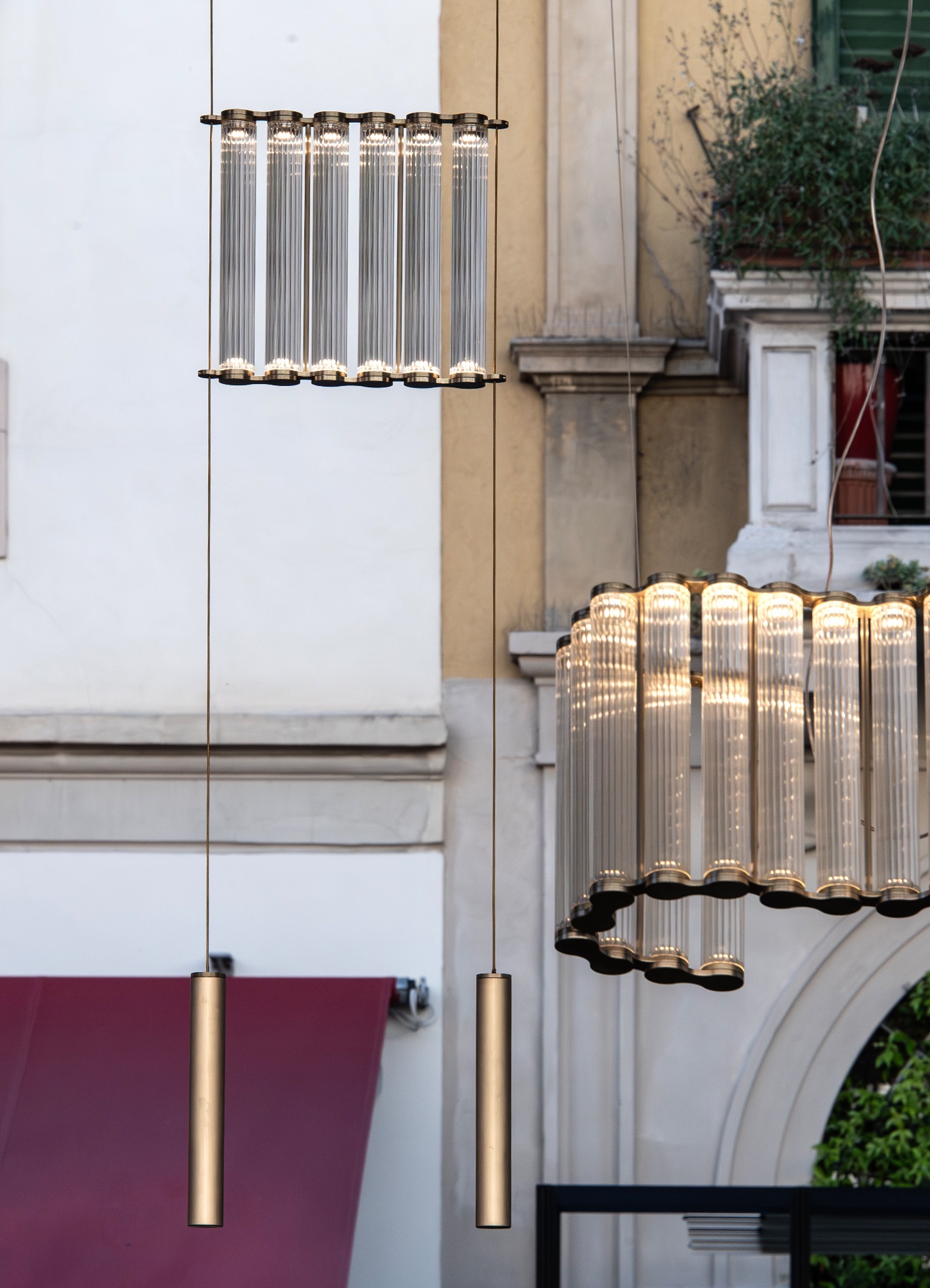 IP20-rated modular suspension lighting system for indoor use, made of oxidized aluminum with internally ribbed glass cylinders. system developed to integrate copper-coated steel suspension cable and brass braid that enables power supply. versions: coppibartali 1952 01, two modules with cable pair. coppibartali 1952 02, three modules with three cables. coppibartali 1952, single module wired with adjustable electronic source Ra98 48Vdc 18W 1722lm with different configuration possibilities, set up for installation on cable pair with opposite polarity. components: ceiling mounting kit, counterweight and floor tie rod for single cable and suspension cables length 10000mm, 30000mm and 100000mm. power supply excluded, to be installed remote. finishes: ottone ap-s.