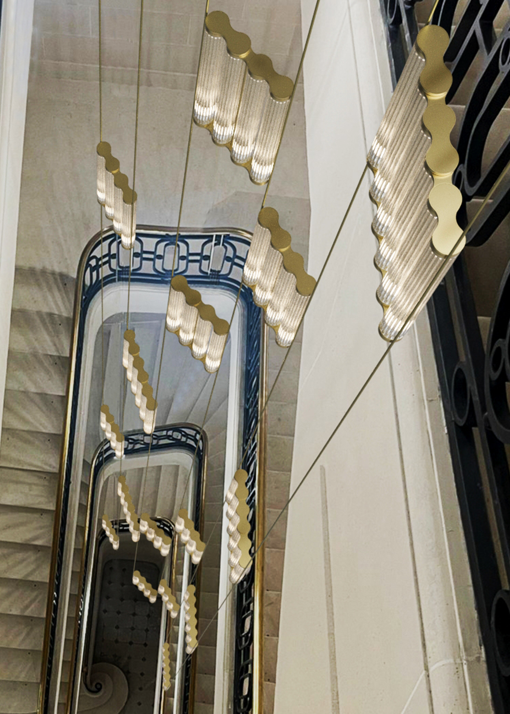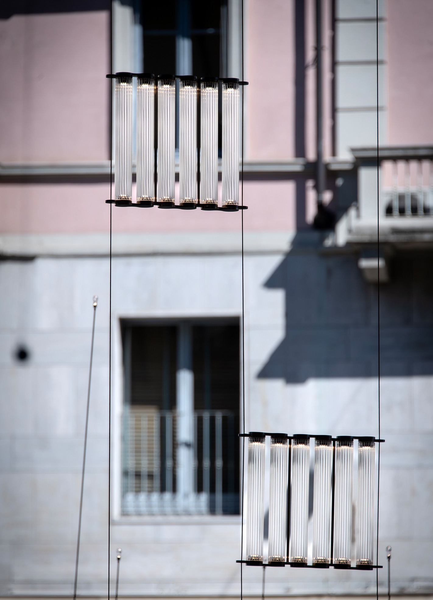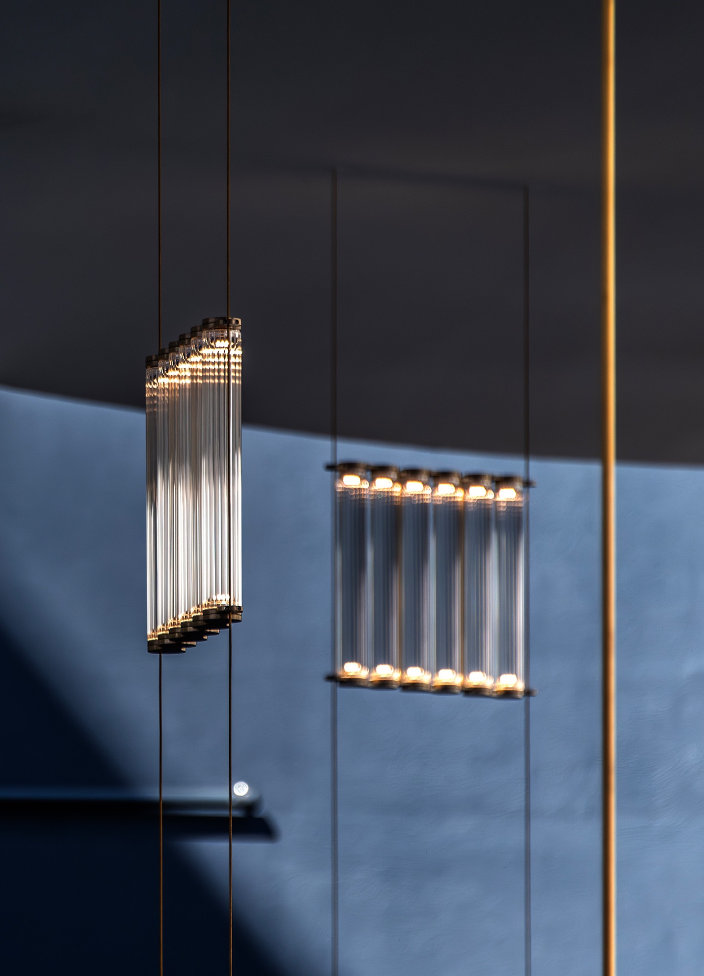 IP20-rated modular suspension lighting system for indoor use, made of oxidized aluminum with internally ribbed glass cylinders. system developed to integrate copper-coated steel suspension cable and brass braid that enables power supply. versions: coppibartali 1952 01, two modules with cable pair. coppibartali 1952 02, three modules with three cables. coppibartali 1952, single module wired with adjustable electronic source Ra98 48Vdc 18W 1722lm with different configuration possibilities, set up for installation on cable pair with opposite polarity. components: ceiling mounting kit, counterweight and floor tie rod for single cable and suspension cables length 10000mm, 30000mm and 100000mm. power supply excluded, to be installed remote. finishes: ottone ap-s.