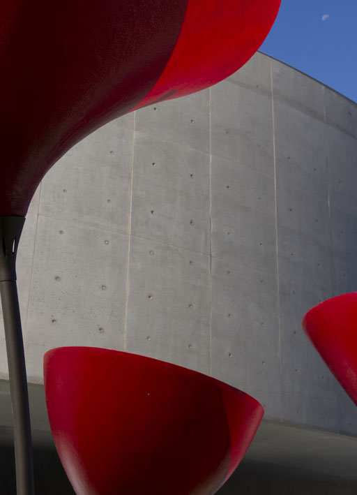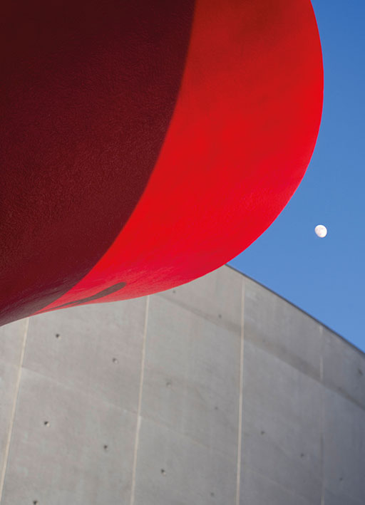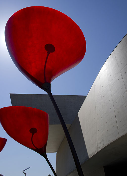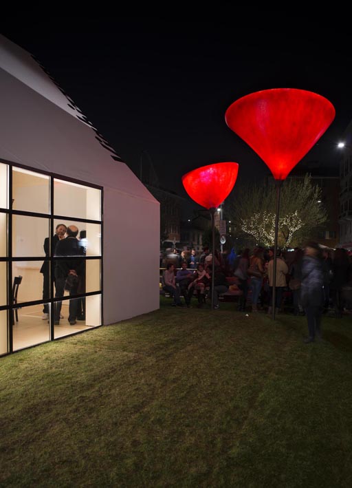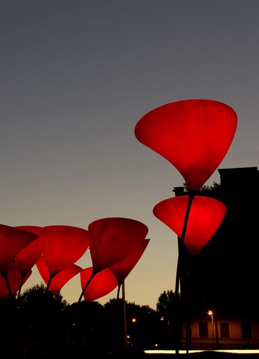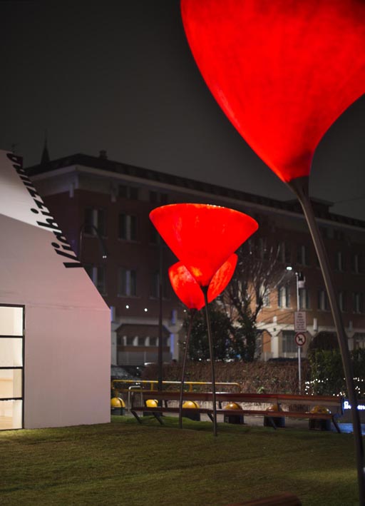 IP65 floor standing light fitting for outdoor use made of a fibreglass diffuser fitted to a powder coated steel pole, to be fixed to a special 535mm high steel ground anchor. versions: maxxi poppy 01 with 1800x2050mm elliptical section, a height of 4350mm above ground, wired with 3000K 69.7W 9633lm source, maxxi poppy 02 with 1610x1590mm elliptical section, a height of 3930mm above ground, wired with 3000K 69.7W 9633lm source, poppy 03 with 840x760mm elliptical section, a height of 2040mm above ground, wired with 3000K 34.2W, 5253lm source, 240V 50Hz power supply not included, to be installed in a special cable draw pit. finishes: red fibreglass, antique brown pole.