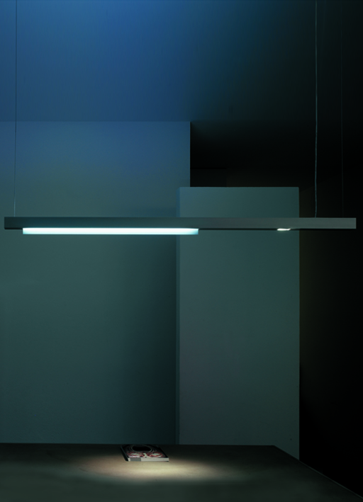 corpo illuminante a sospensione per interni in alluminio ossidato argento o bruno disponibile in tre dimensioni: 62.99”, 74.8”, 86.61”. alloggiano rispettivamente lampade fluorescenti G5 da 21W a 35W per luce diffusa ed omogenea e, in ogni versione, una lampada dicroica GU4 35W completamente nascosta all’interno del profilo che, tramite la regolazione di uno specchio contrapposto, crea una luce d’accento emozionale. l’apparecchio viene fornito completo di cavo di alimentazione.