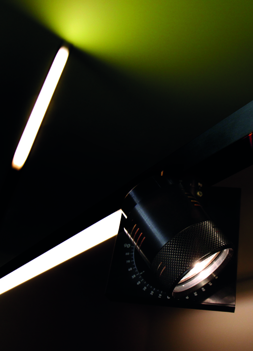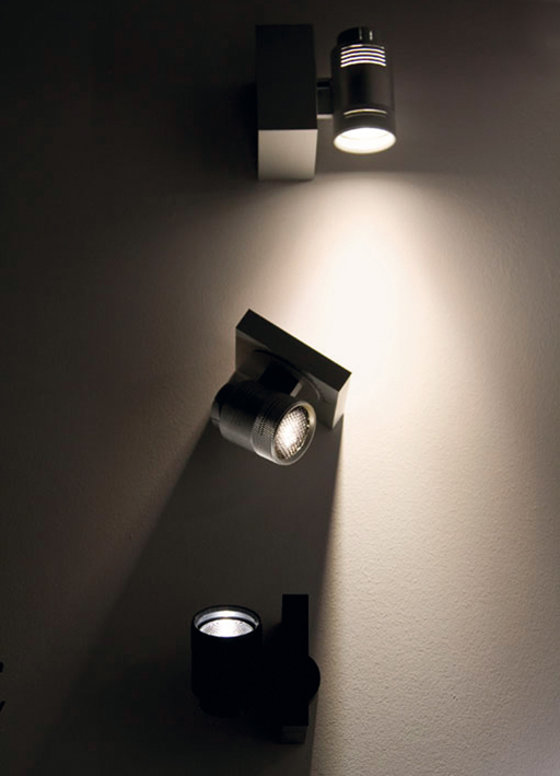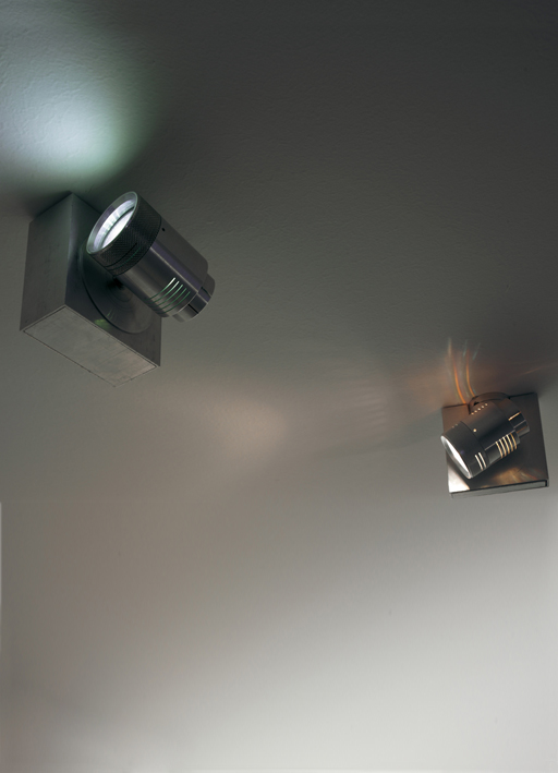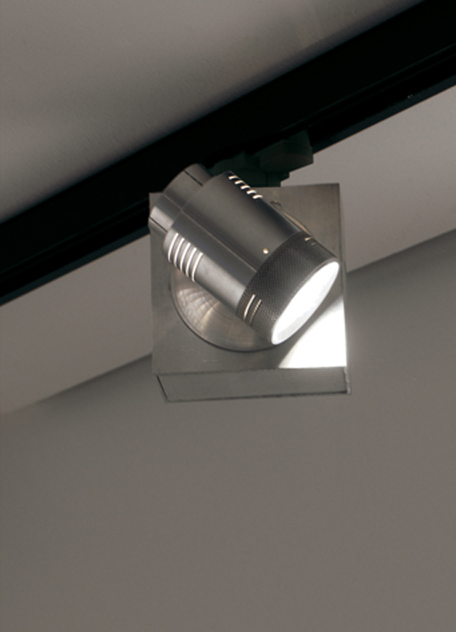 corpo illuminante-proiettore da interni, previsto nella versione a parete, soffitto o binario. è realizzato in estruso di alluminio ossidato nero o argento o bianco. disponibile nella versione per lampade alogene GU5,3 50W e G53 50W con trasformatore incorporato e a ioduri metallici GX10 20W e G12 39W con ballast incluso. il corpo lampada può ruotare mediante uno snodo a sfera sull’asse verticale di 355° e su quello orizzontale di 180°. vengono forniti come accessori il frangiluce a nido d’ape e il sagomatore cilindrico per modellare la luce nella forma desiderata tramite gli appositi coltelli e per regolare la messa a fuoco del fascio luminoso tramite l’apposita ghiera.