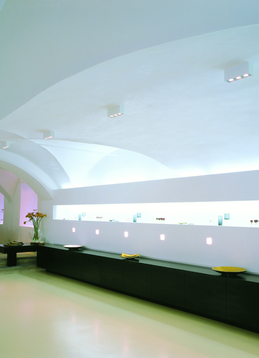 lampada da soffitto per interni, a luce diretta e indiretta, in acciaio inox lucido, in metallo verniciato bianco o grigio, oppure in ottone anticato. può alloggiare lampade fluorescenti con attacco 2G11 36W.
