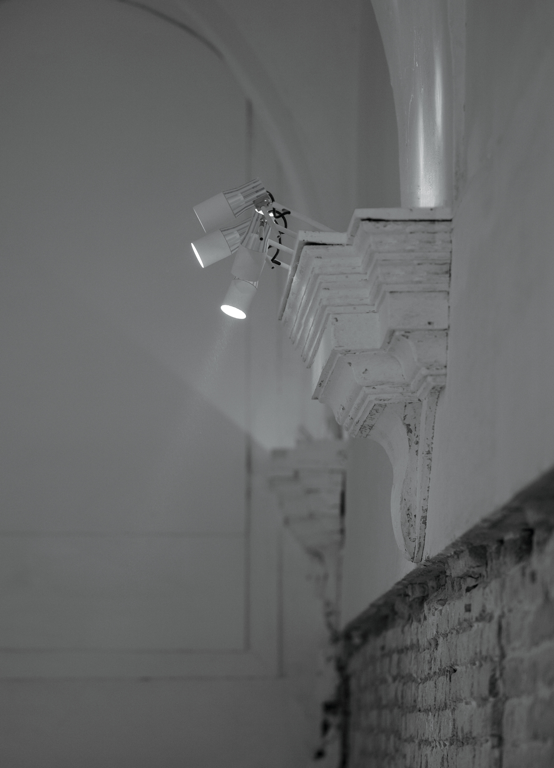 aluminium spotlight adjustable on the three axes with a natural brass detail that marks the spherical hinge between the joint of the rod, which permits the 360° rotation on the vertical axis and a 90° rotation on the horizontal axis, and the handle, which ables an easy adjustment.