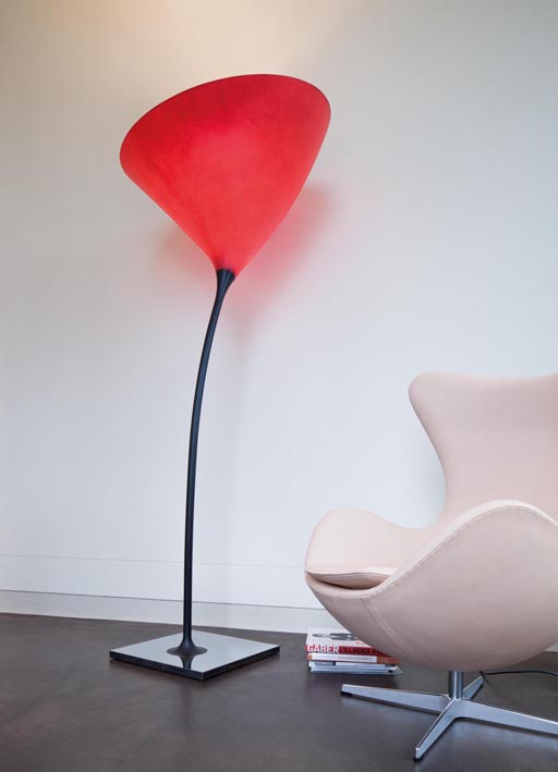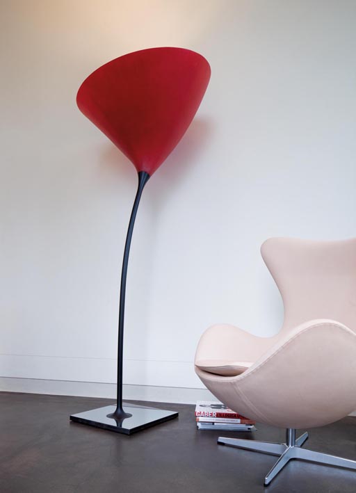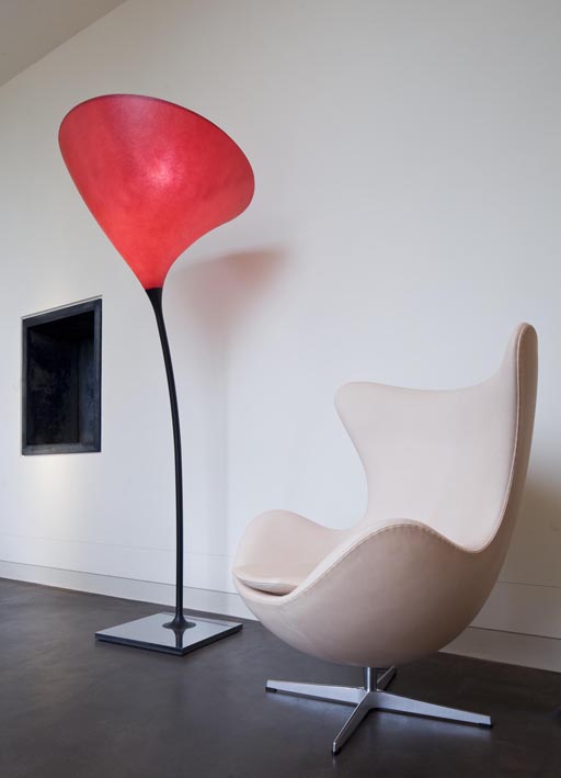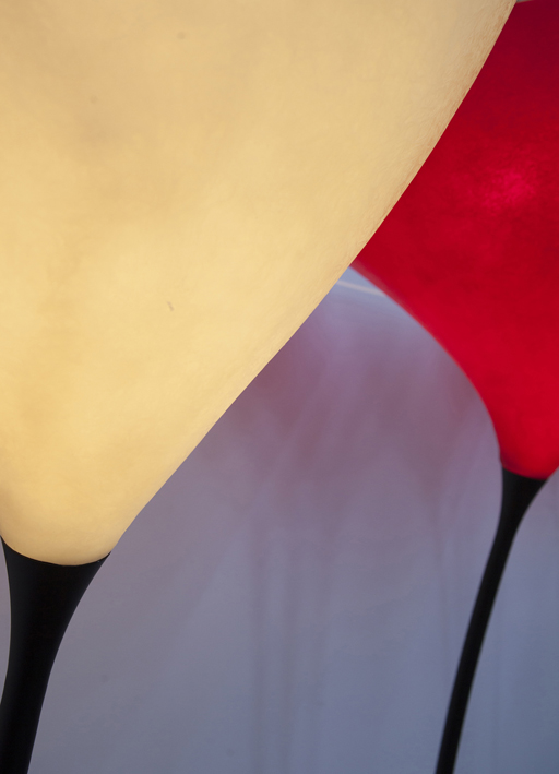 made of a fibreglass diffuser with a 760x840mm elliptical section, a h.2040 oxidised aluminium rod and a 450x450mm powder coated steel square base.