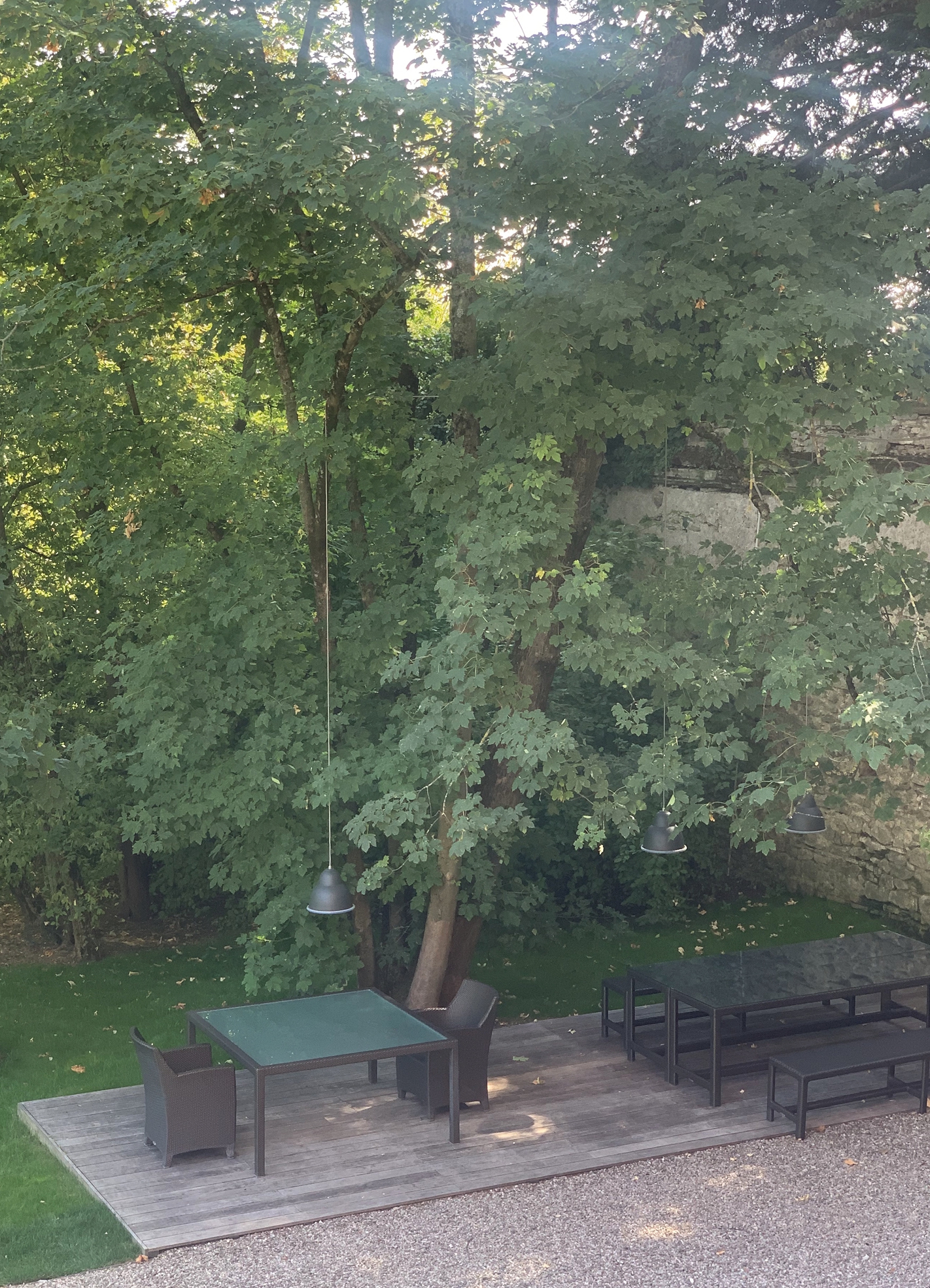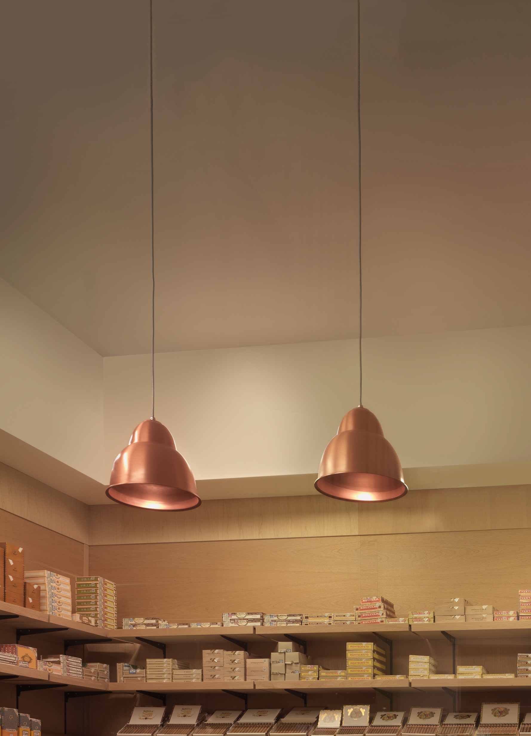 made of powder coated oxidised aluminium or copper, with a diameter Ø345mm h.300mm diffuser, a h.3000mm suspension cable covered with a stainless steel sleeve and ceiling