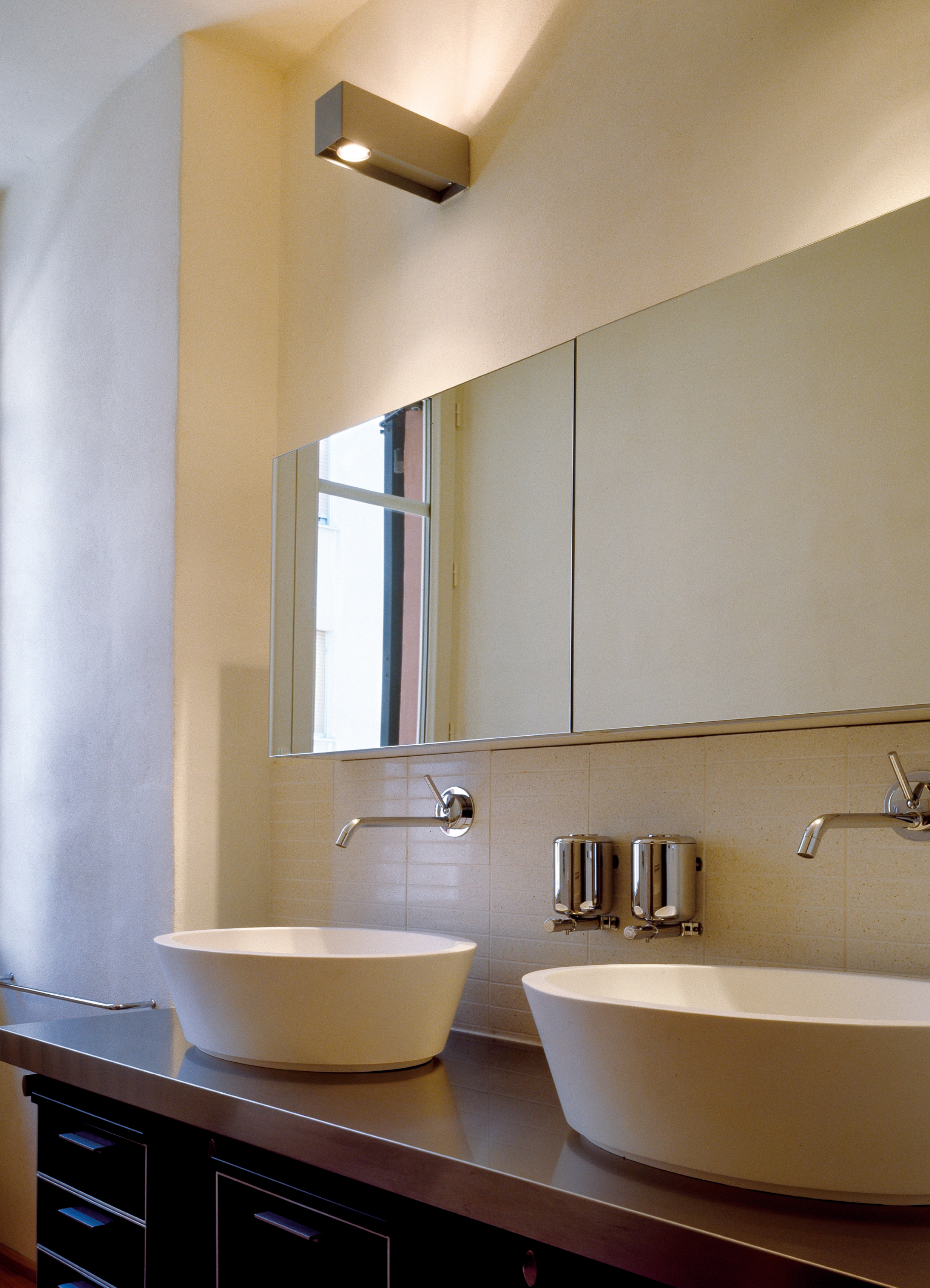 net 24 parete biemissione with 20° direct light 6.8W up to 493lm adjustable by 360° on the vertical axis and by 20° on the horizontal axis, provided with an anti-glare ring ensuring high visual comfort, and diffused indirect light 12.4W up to 1105lm with protective transparent glass.