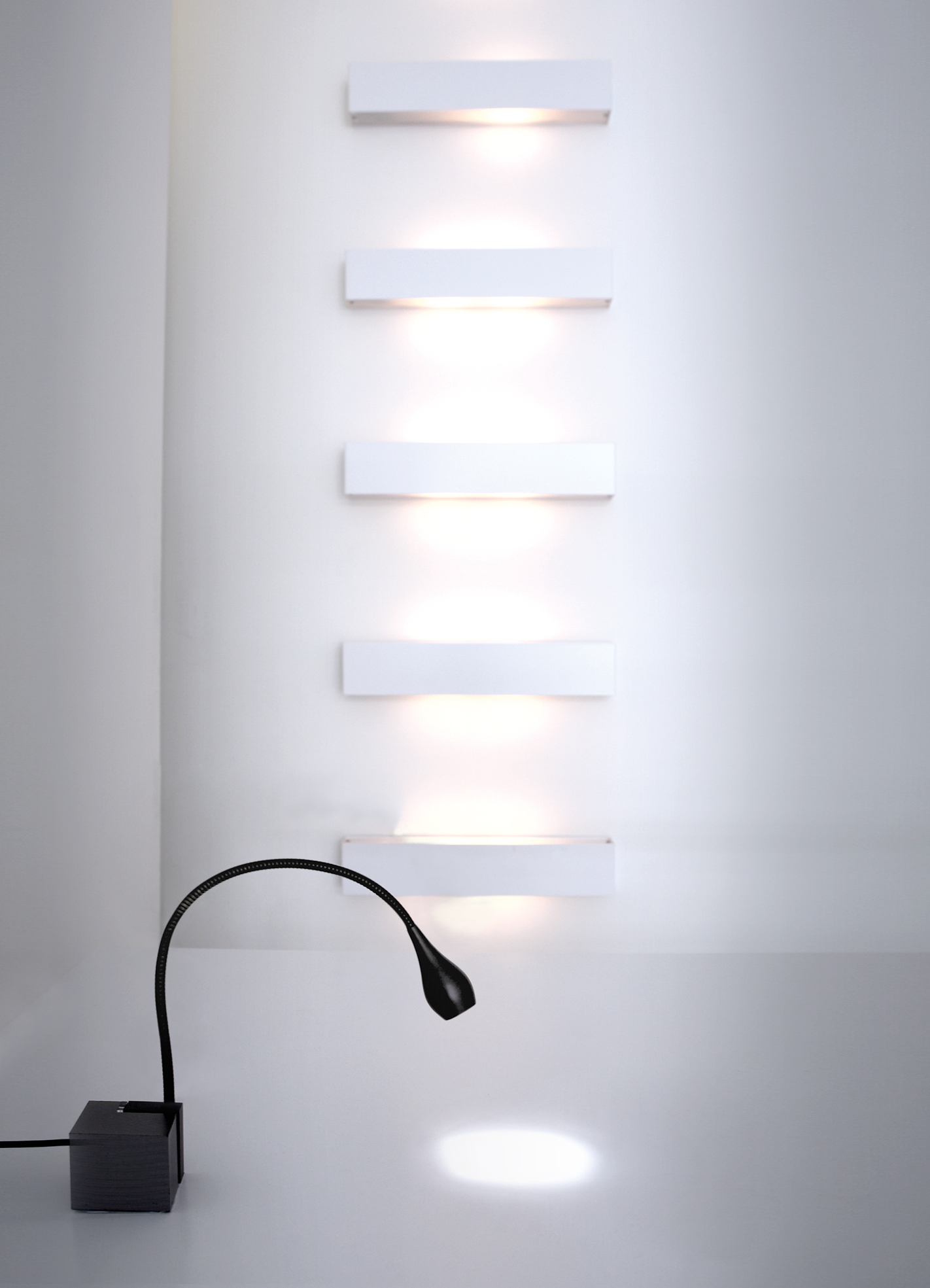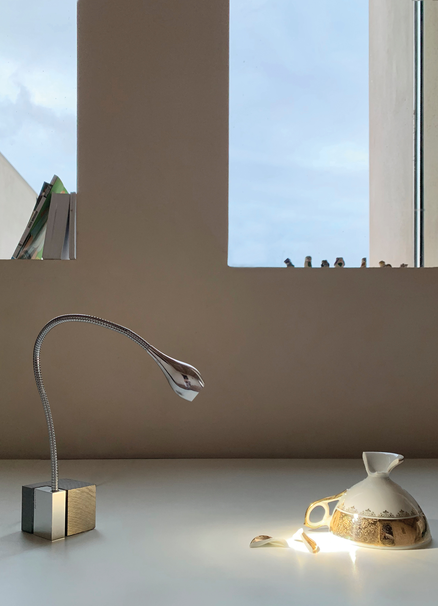 made of oxidised aluminium, it consists of a head with the light source and a flexible rod having a length of 200 mm that can be adjusted in every direction.