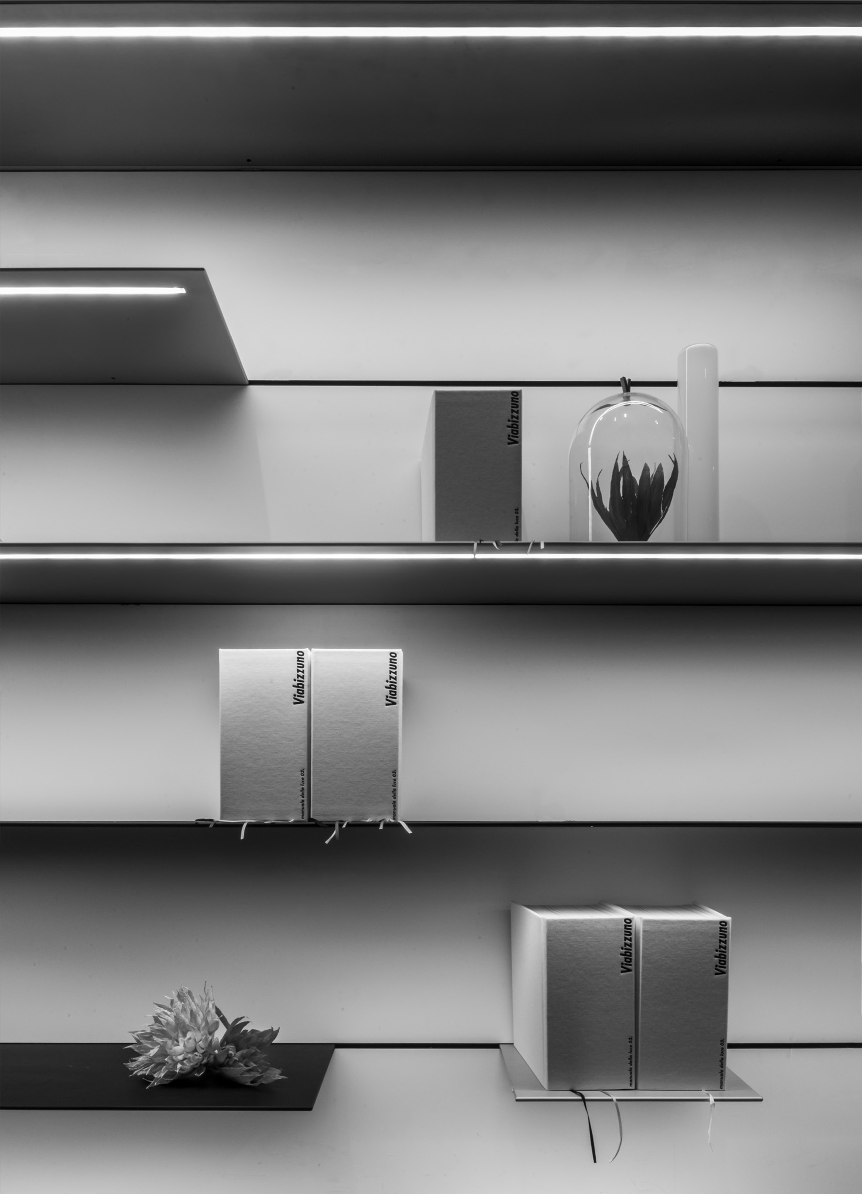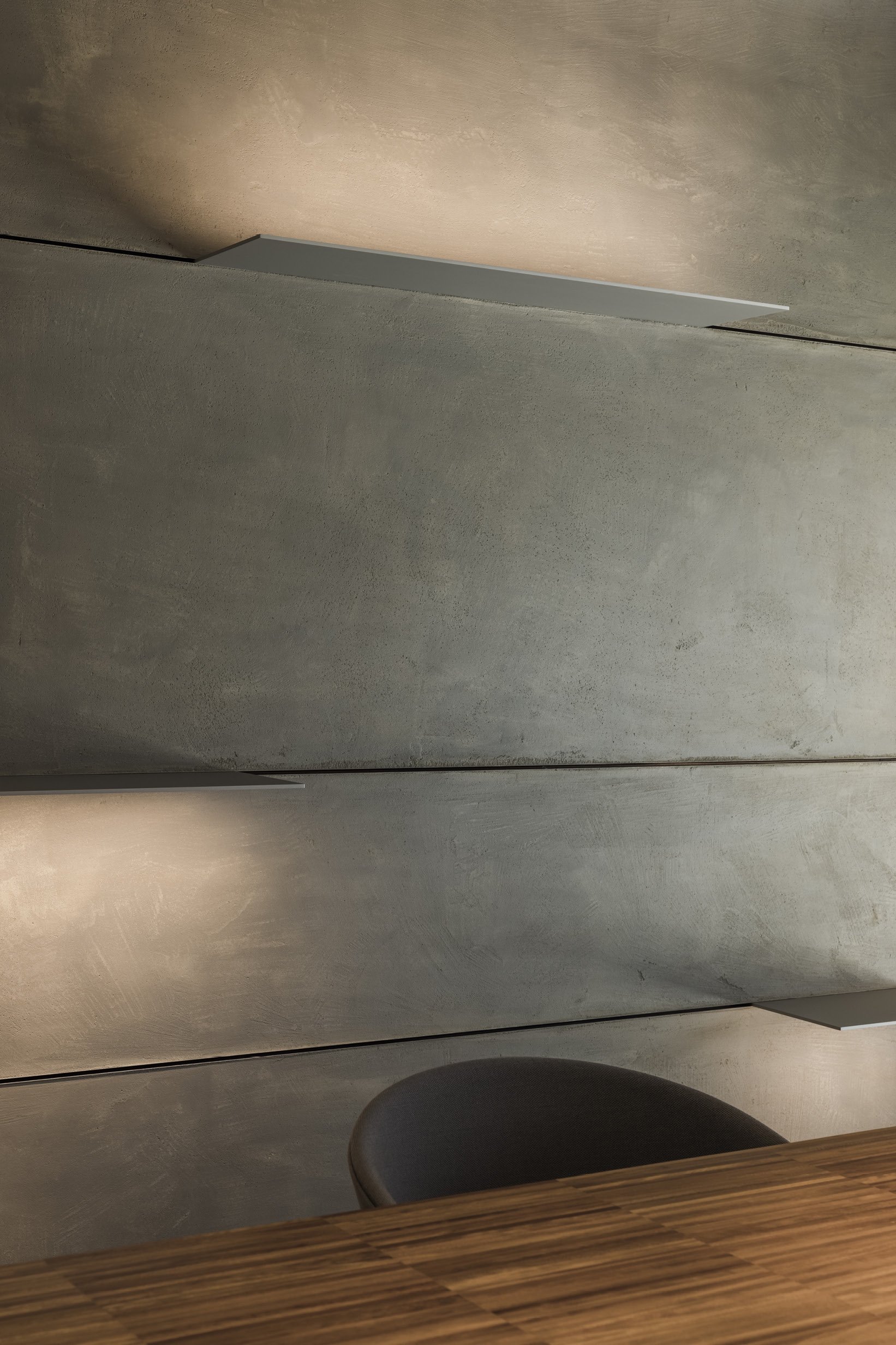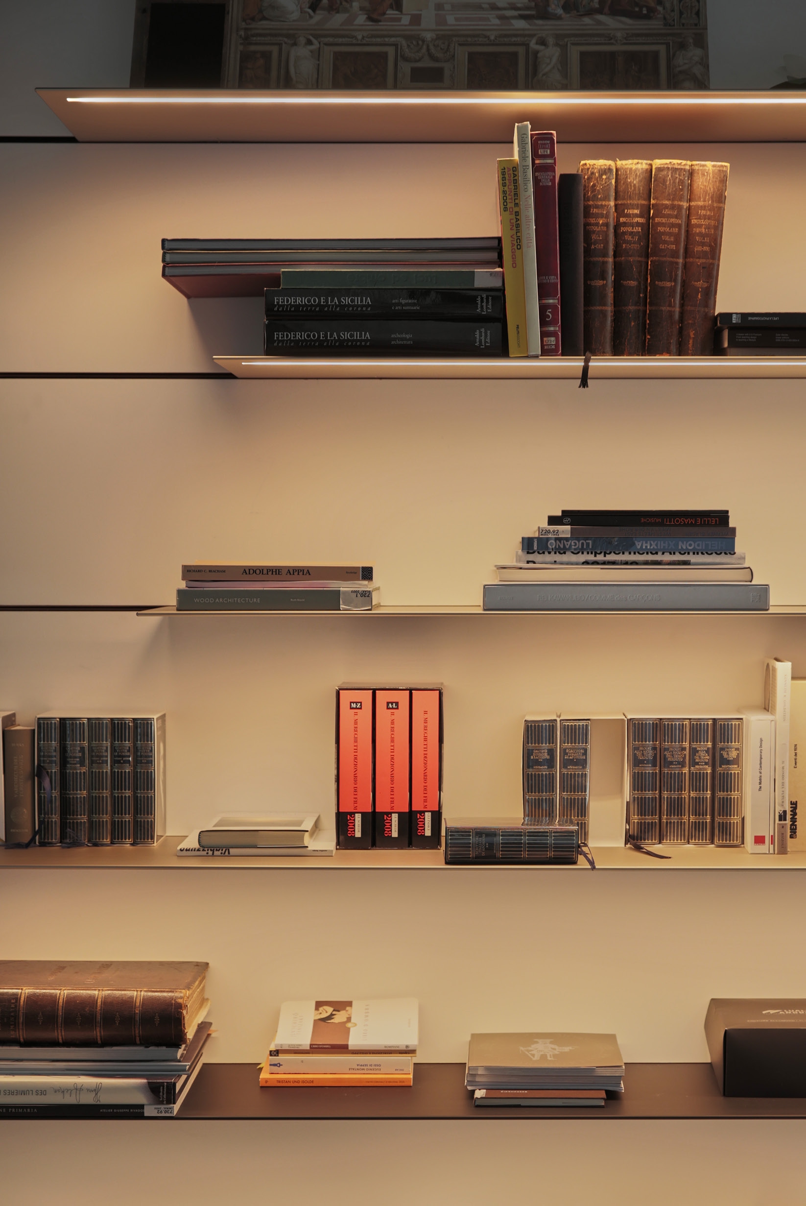IP20-rated wall system with luminous movable shelves recessed in a fully concealed electrified track for indoor use, accessible from the front through a 6mm thick slot.