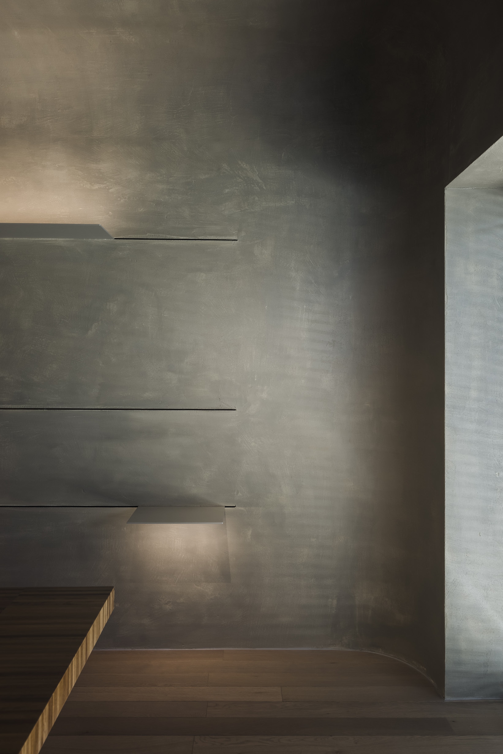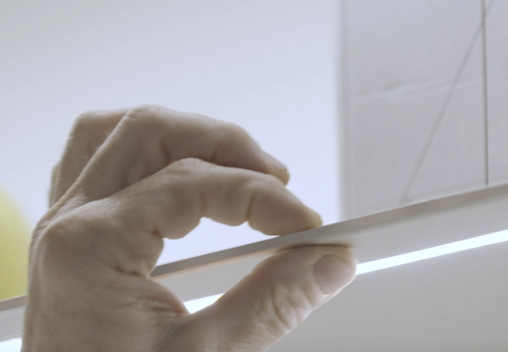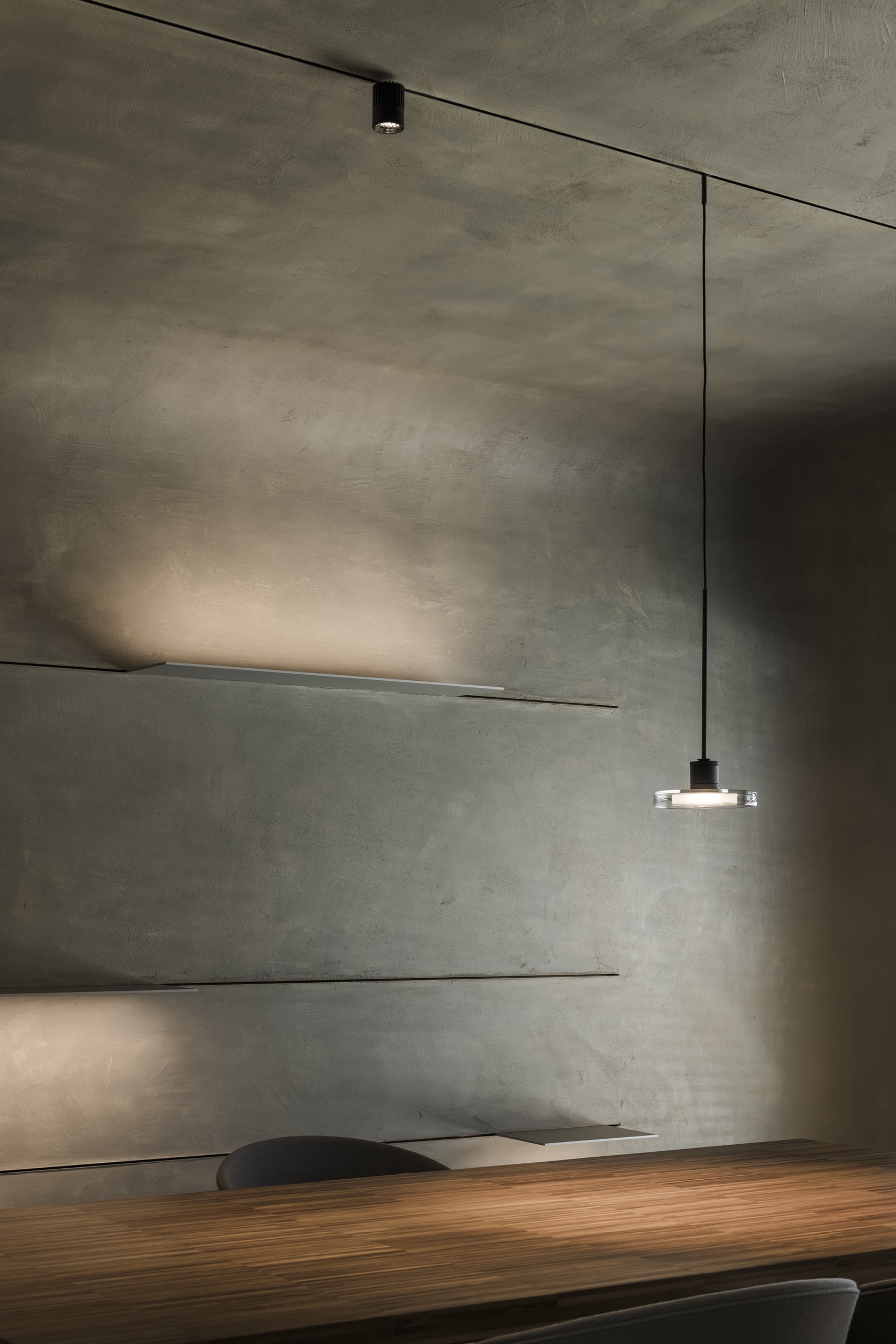 IP20-rated wall system with luminous movable shelves recessed in a fully concealed electrified track for indoor use, accessible from the front through a 6mm thick slot.