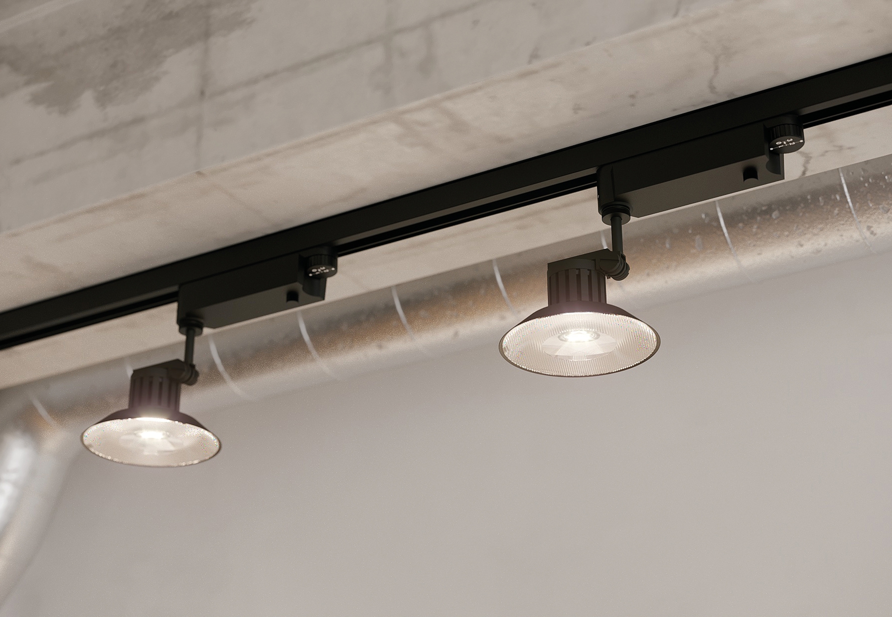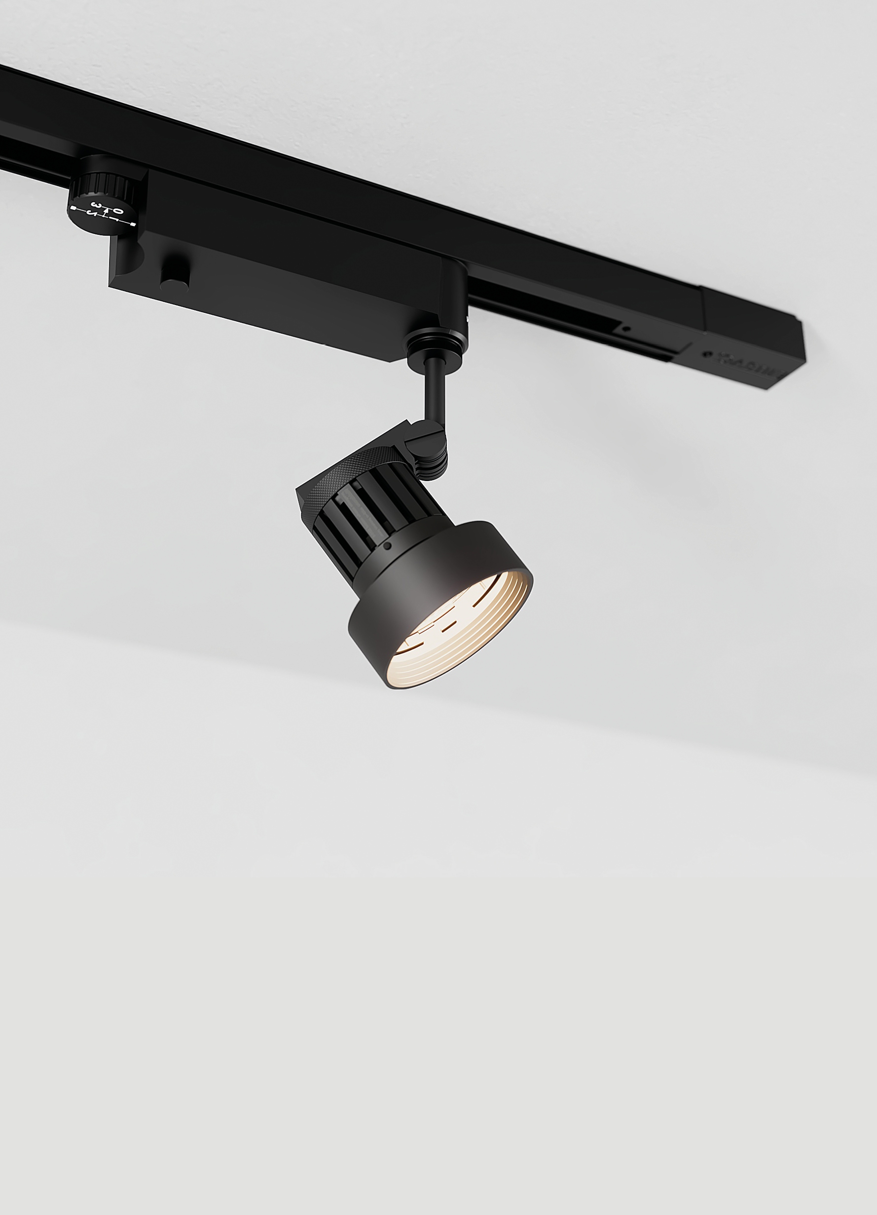 IP20-rated track system for indoor use. it consists of an extruded oxidised and powder coated aluminium having a 36x32mm section serving as an earth conductor and an insulating rubber insert that contains 4 copper conductors with a section of 2.5mm². sizes: 2000 and 3000mm. supply voltage: 3~230V 50-60Hz up to 16A. accessories: left and right-hand power supply board, lateral end cap, linear joints, curved joints, T-shaped joints and X-shaped joints, steel suspension cable, rigid suspension rod, ceiling support, profile for recessed mounting, mechanical universal display hook, track adapter. finishes: white, black and matt silver.