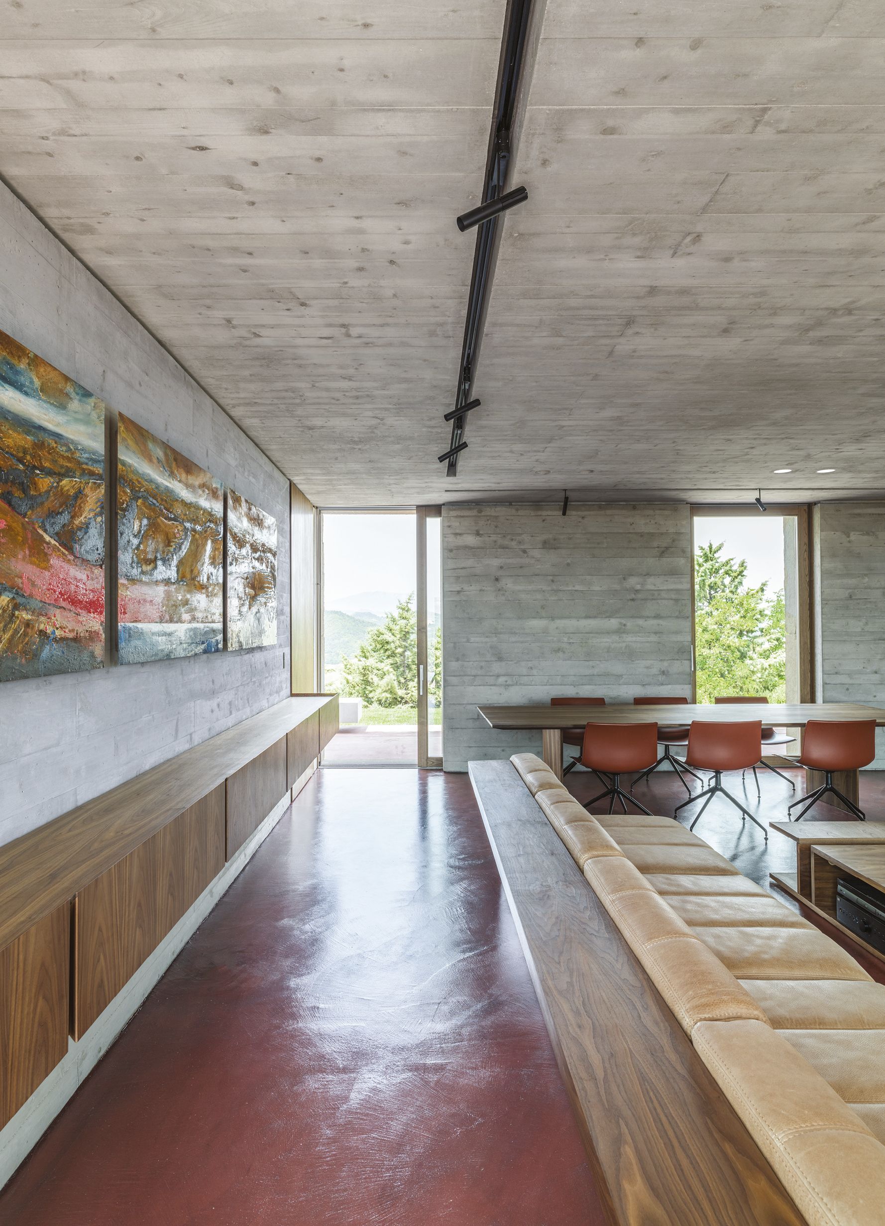 Die Gebäude repräsentieren sich der Landschaft in ihrer Schale aus Stein sowie durch den Verzicht auf überflüssige Elemente wie Dachrinnen und Fallrohre und ihre wohl gedachten Proportionen
