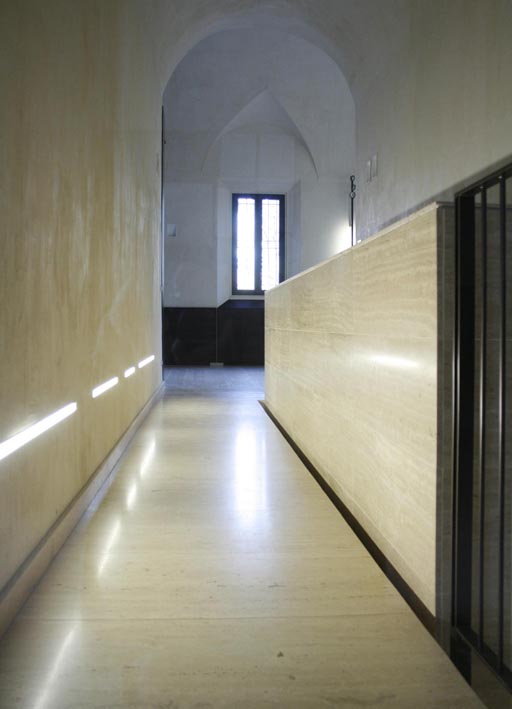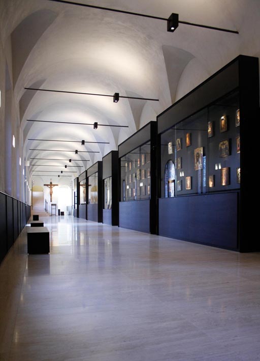Die Bibliothek des Klosterkomplexes von Sankt Anton aus Padua in Bologna wurde vollständig renoviert und erweitert, um dem wachsenden Buchbestand gerecht zu werden und sie gleichzeitig für die Besucher zweckmäßiger zu gestalten. Der Umbau betraf die Räumlichkeiten im Tief- und im Hochparterre und umschloss neben der Bibliothek auch die Theologie-Schule mit der Einrichtung eines suggestiven 'Ikonen-Museums', das einen Teil einer den Mönchen gehörenden Privatsammlung russischer Ikonen aus der Zeit zwischen dem 17. und dem Anfang des 20. Jahrhunderts beherbergt. Die Ausstellung umfasst 100 Ikonen, die vorwiegend durch das Licht zur Geltung gebracht werden, das eine Atmosphäre der Andacht und des Gebets wieder aufleben lässt und an das Kerzenlicht erinnert, d.h. an die Lichtquelle, die diese Werke sowohl in den Kirchen als auch in den privaten Behausungen im Lauf der Jahrhunderte begleitet hat. Jede Ikone wird durch Led-Strahler Zero Orientabile mit 8°- und 30°-Optik und Leistung von 1 oder 2 Watt beleuchtet. Darüber hinaus wurde ein System ausgearbeitet, das die Schaffung unterschiedlicher Szenarien gestattet, indem je nach den unterschiedlichen religiösen Gedenktagen nur bestimmte Gruppen von Ikonen beleuchtet werden. Auch die Beleuchtung des Korridors wurde mit dem Ziel geplant, dem Kloster wieder eine andächtige Atmosphäre zur verleihen. Dazu wurden Einbau-Elemente verwendet, die Nischen mit Kerze simulieren, ergänzt durch Leuchtkörper 'Mosaico' und 'Catena', die architektonische Einzelheiten oder Kunstwerke hervorheben. Das natürliche Tageslicht spielt im gesamten Projekt eine wichtige Rolle. Deshalb wurde bei der Planung versucht, der nächtlichen Beleuchtung, die den Weg still wie ein Gebet durch das ganze Kloster begleitet, dasselbe Gleichgewicht zu verleihen. Vom zentralen Korridor, der das Bindeglied zwischen dem Ostflügel und dem zentralen Flügel darstellt, wurde ganz neu die vertikale Hauptverbindung des Bibliothek-Systems realisiert: eine gerade Treppe, die den Durchgang zur Hälfte auf einer Breite von ca. 90 cm einnimmt und den Zugang zu den Lese- und Archivräumen bildet. Die metallische, mit Travertinstein verkleidete Treppe liegt auf einer zentralen Mauer mit der gleichen Verkleidung auf, die in der Höhe das doppelte Raumvolumen durchquert und als Brüstung für die Laufbrücke der oberen Ebene dient. Die Treppe und die Laufbrücke sind nicht mit den seitlichen Wänden verbunden: diese Lösung trennt die neuen Baumaßnahmen vom alten Bau und gestattet somit ein eindeutiges Erkennen und Interpretieren des Projekts, während sie zugleich dem Ganzen ein unverkennbares Gefühl von Leichtigkeit vermittelt. Die Rationalisierung der Räumlichkeiten im Untergeschoss hat die Nutzung von ehemaligen Kellern und Lagern gestattet, die in ruhige, suggestive und zweckmäßige Räume verwandelt wurden. Der Lagerraum wurde erweitert und konsolidiert und darf sich heute eines äußerst fortschrittlichen Archivierungssystems rühmen, das in der Lage ist, 2300 Bücher sowie weitere 300 in der als historisches Archiv genutzten Zone aufzunehmen. Zwischen dem Ausgabebüro und dem Lesesaal findet sich das Archiv des 'fondo antico' (antiker Grundstock), d.h. das Herz der Bibliothek, das durch die Installation einer großen Glaswand bewusst einsehbar gehalten wurde. Allgemein gesehen hat die Maßnahme die architektonischen Elemente und die ursprüngliche Raumaufteilung ins Licht gerückt und zur Geltung gebracht, dank des Einsatzes von Glas als Raumteiler und der nach Zeichnung erfolgten Realisierung aller Nischen-Regale, die mit den gleichen Materialien der Theken realisiert wurden. Auch die Wandflächen des Tiefparterres wurden soweit wie möglich restauriert und beibehalten. Um den strengen Charakter des Projekts zur Geltung zu bringen, wurden alle Bodenbeläge durch klassischen, harzbeschichteten und nach Zeichnung fächerförmig gebürsteten Travertinstein ersetzt, der den Benutzer diskret auf allen Wegen begleitet, ebenso wie das Licht, das stille und zugleich prägende Element der gesamten Maßnahme, Außenbereiche inbegriffen.