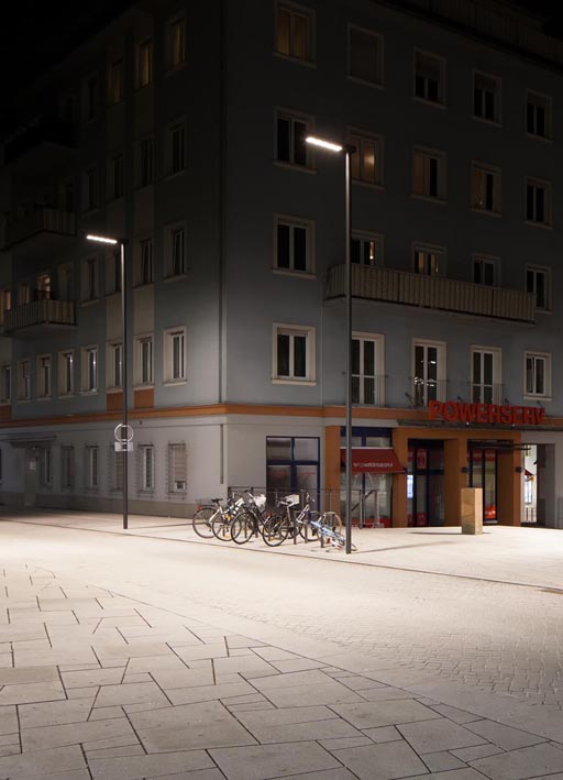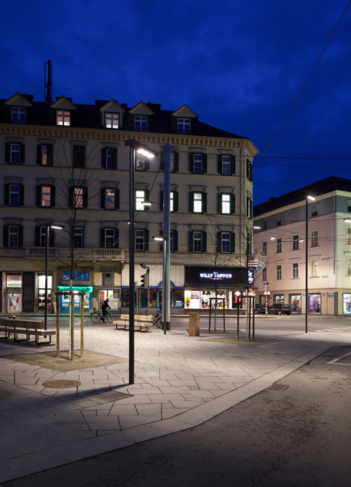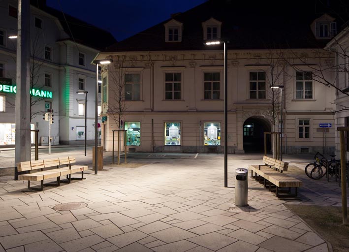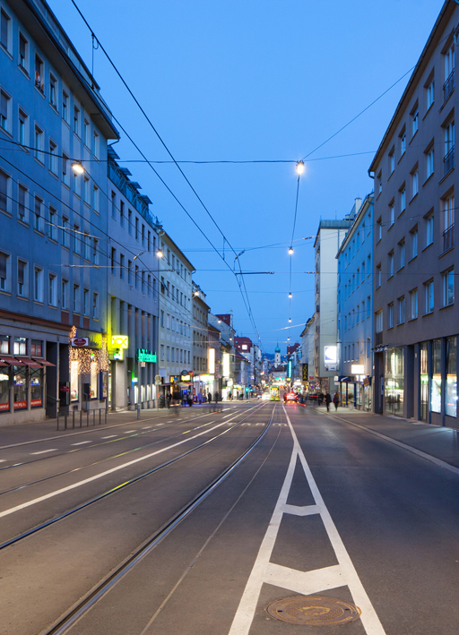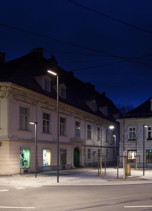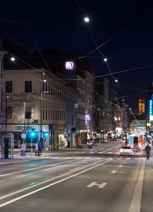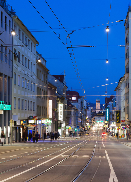 Die aus der Renaissance stammende Altstadt von Graz wurde 1999 von der Unesco zum Welterbe der Menschheit ernannt. Die Annenstraße, die ihren Namen von der Kaiserin Maria Anna von Savoyen hat, verbindet den Hauptbahnhof von Graz mit der Stadtmitte. Als sie im Jahr 1846 fertiggestellt wurde, symbolisierte sie den Fortschritt des modernen Zeitalters: sie war in der Tat die erste breite und gerade verlaufende Straße von Graz. Im Jahr 1900 war die Annenstraße bereits zu einer blühenden Geschäftsstraße geworden, mit zwei großen Theatern, dem Annenhofkino und dem Edison –Theater, später Union-Kino. Nach dem Wiederaufbau am Ende des zweiten Weltkriegs verwandelte sich die Straße nach und nach in eine Geschäftsstraße der ‘upper-class’ und wurde schließlich zur drittgrößten Einkaufsstraße von Österreich. Die Stadtmöbel, die Verkehrsführung und der Straßenbelag der Annenstraße wurden in jüngerer Zeit erneuert. Darüber hinaus wurde sie aus Gründen der Gleichförmigkeit “ins neue Licht gesetzt”, um den Asphalt der Straßendecke gleichmäßig auszuleuchten. Das Ergebnis ist ein Licht, das Wohlbehagen vermittelt, nicht blendet, eine gute Farbwiedergabe sowie unterschiedlich ausgeleuchtete Bereiche bietet. Um dieses Ziel zu erreichen wurden asymmetrische Lampen mit 4 bündig montierten, gerichteten Leds, aber auch Lichtmasten mit kleinen Lichtpunkten in der Höhe, kombiniert mit anderen, größeren Masten mit intensiverem, diffusem Licht. Das gesamte Projekt basiert auf einer optimalen Reflektor-Technologie, die maximalen Sehkomfort gewährleistet und ein gefälliges, elegantes und mit Rücksicht auf die Geometrie der Straße und der Plätze definiertes Gehäuse bietet. Das Aussehen der Beleuchtungskörper und ihre Lichteffekte wurden auch mit Rücksicht auf die historische Eleganz der Gebäude und in Harmonie mit dem für die Erneuerung des Bodenbelags der Straßen und drei an der Annenstraße liegenden Plätze verwendeten Natursteins gewählt und entworfen. Dank der neuen Verkehrsführung, durch die sich die den Fußgängern vorbehaltenen Bereiche vergrößern, wird die Straße in jeder Hinsicht zu einer Art öffentlichem Wohnraum, in dem man eine entspannte Atmosphäre genießen kann. Der Wechsel von mehr oder weniger stark ausgeleuchteten Bereichen schafft in der Stadt ein Szenario, das es zu erforschen gilt.
