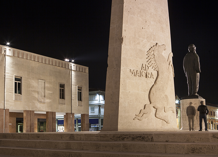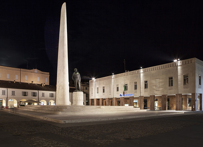 Der Mittelpunkt des Lebens in Lugo sind Piazza Baracca und das Monument, ein Werk des Bildhauers Domenico Rambelli aus Faenza. Beide sind dem Flughelden des Ersten Weltkriegs Francesco Baracca gewidmet, der 1888 eben in Lugo zur Welt kam. Das im Jahr 1936 eingeweihte Monument bedeckt eine Fläche von 1040 m² und ist vollständig bekleidet mit Travertinstein aus Tivoli. Die Bronzestatue des Baracca ragt auf einem Sockel empor, auf dem die Siege des Fliegers eingemeißelt sind, während an den Seiten des Flügels die Symbole der Abteilungen eingemeißelt sind, denen Baracca angehört hatte: das aufbäumende Pferdchen mit dem Motto “ad maiora” und der Hippogryph. Die neue Beleuchtung des Platzes ist Teil eines allgemeineren Projekts zur Erneuerung der Beleuchtung der gesamten Altstadt. Ziel war es, der Stadt und ihren Bürgern einen auch nachts lebendigen Platz zurückzugeben und die Fülle des historischen, architektonischen und kulturellen Szenarios hervorzuheben, das durch Licht zur Geltung gebracht werden kann.