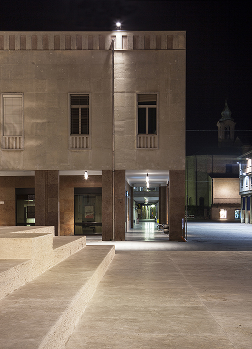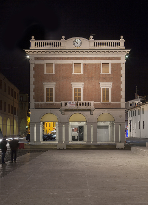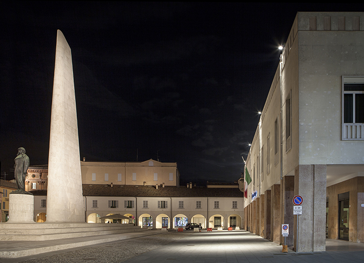 Das Projekt schenkt nicht nur dem Brennpunkt, d.h. dem Baracca-Monument seine Aufmerksamkeit, ganz im Gegenteil: das Licht stellt die Fassaden und die Volumen in den Vordergrund, die das Stadtbild ausmachen. Anstatt eine einzige Hauptfigur zu sein, wird das Monument metaphorisch zum Angelpunkt der Beleuchtung anderer Gebäude. Das künstliche Licht hebt das komplexe Stadtbild hervor, gleichzeitig aber auch die einzelnen Bauten, als erzähle es die Geschichte von Lugo. Unter technischen Gesichtspunkten werden die Statue und der Flügel des Monuments an Francesco Baracca asymmetrisch beleuchtet, um das Erkennen der Abmessungen des Werks, der Materialien und der Oberflächenbearbeitung zu ermöglichen. Das Podium ist mit einer flexiblen Beleuchtung ausgestattet, die eine weitgehend individuelle Gestaltung für Veranstaltungen und Vorführungen ermöglicht. Die Fassade des Palasts der Banca di Romagna erscheint wie ein großes Szenenbild, während der Palazzo Mengoni durch Lichter bereichert wurde, die sich auf die weiter entfernten architektonischen Einzelheiten konzentrieren (Glockenturm und Fassade). Die Kirche und der Palast der ehemaligen Versicherung Reale Assicurazioni werden frontal mit weichem, diffusem Licht beleuchtet, das seine Einzelheiten hervorhebt, während die Lauben entlang den Routen beleuchtet sind, um das Gefühl von Gastlichkeit und Gefälligkeit zu vermitteln.