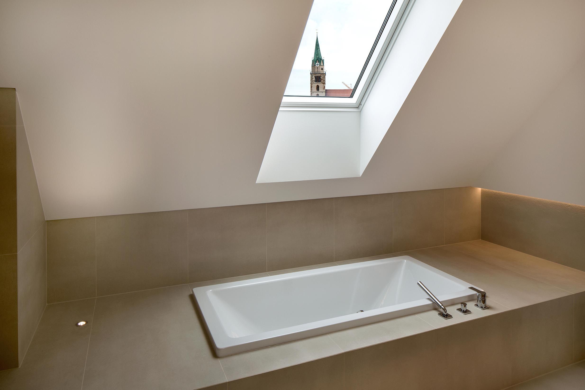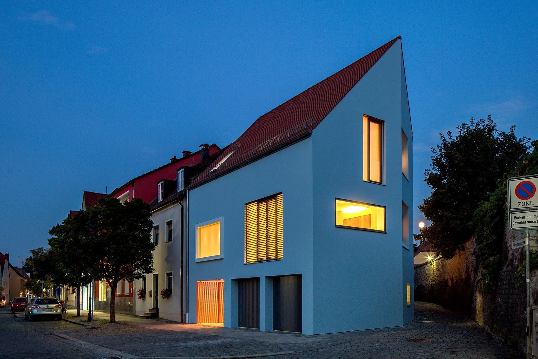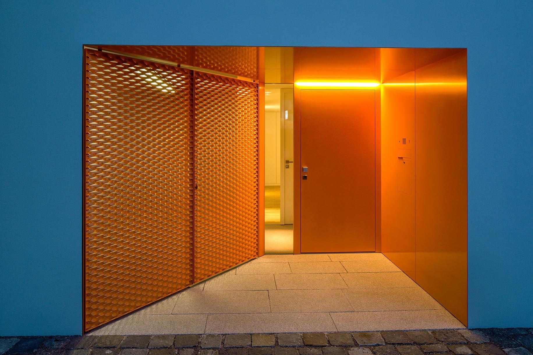 Ein modernes Haus mit unkonventioneller Architektur, das sich jedoch sehr gut in die Umgebung der Altstadt einfügt. Die Herausforderung, die dem Projekt des Studios Berschneider + Berschneider zugrunde liegt: einen 'Block' mit ausgeprägt geometrischen Linien in das alte Gefüge der Stadt zwischen den Wohngebäuden und den Mauern des Viehmarkts eingliedern. Im Inneren macht die integrierte und lokal hergestellte Einrichtung die Wohnung geräumiger. Die Materialien und Flächen dehnen sich auch auf die Wände, die Türen und die Möbel aus. Jedes Detail wurde sorgsam ausgefeilt, ebenso wie die Qualität der Materialien für jeden Raum achtsam ausgewählt wurde. Die Planung erfolgte außerdem im Zeichen der Umweltverträglichkeit: die Wärmepumpe liefert Warmwasser und die erzeugte Energie versorgt auch das Photovoltaiksystem auf dem Dach. Das Tageslicht und die Beleuchtung allgemein sind wesentliche Bestandteile des Projekts. Die Beurteilung, wieviel Tageslicht angesichts des Ausdehnung der Nachbarbauten ins Innere des gelangt, war eine weitere Herausforderung für die Planer. Trotz der beschränkten Größe der Räume ist es den Architekten gelungen, die Stockwerke offen zu gestalten und ein geräumiges Dach zu entwerfen. Auch die Innenräume gewinnen dadurch sehr viel 'Atemfreiheit'. Dank der Öffnungen der Fassade, die das Tageslicht in die Wohnung lassen, entstehen verschiedene Licht-Szenarien: Tageslicht, Schatten, Reflexe. Dem hellen Blau der Außenhülle steht das warme Licht gegenüber, das aus den Innenräumen dringt. Genau das ist es, was schon von außen das Gefühl einer entspannten, familiären Atmosphäre vermittelt. Wenn das Licht eingeschaltet ist, wird das Haus warm, gemütlich, lebendig. Eine Wärme, die die Familie oder den Besucher schon am Eingang einhüllt, wo die über dem Türpfosten angebrachte Leuchte c2 led den metallischen Innenwänden Wärme verleiht. Der gleiche Beleuchtungskörper rückt auch einige vertikale und horizontale Holzflächen im Inneren in den Vordergrund, während der Beleuchtungskörper c2 rotante die Aufgabe hat, den großen Spiegel über den beiden Wasserhähnen im Badezimmer zu beleuchten, wo die Lampe 13x8 der Badewanne eine intime und elegante Atmosphäre verleiht. Der Kontrast zwischen innen und außen wird auch durch die Terrassenbeleuchtung hervorgehoben, wo „zero“ in den Boden eingelassen sind und die große Wand beleben, während die Leuchte c2 unter den Kanten der Geländer am Boden entlang die äußere Seite abgrenzt.