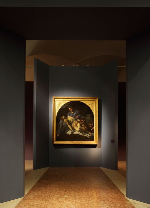 Zur Ergänzung des Direktlichts ein szenografisch-architektonisches Licht, das die stilistischen Unterschiede im Werk des Künstlers unterstreicht: für die ersten Perioden den Halbschatten und das einzige direkte Licht auf den Werken, um ihre Dramatik und ihren Realismus zu unterstreichen; für die Periode der Accademia degli Incamminati werden die Gewölbe mit schmalen Lichtbündeln erleuchtet; ein diffuses und zartes Licht liegt auf den Gewölben der römischen Perioden, das in den Sälen mit Landschaftsbildern und Heiligenfiguren eine kalte Tönung annimmt und in den Sälen, in denen die zarten Zeichnungen ausgestellt sind, einen warmen, ruhigen Ton. Die Ausstellung schließt mit dem großen Gemälde der Pietà, die mit einem konzentrierten Punktlicht auf das im Dunkel hängende Werk hervorgehoben wird. Die Einrichtung und die Flexibilität der Leuchten ermöglichten eine Rationalisierung des Beleuchtungssystems, das Vermeiden von Blendwirkungen und Reflexen auf den großen Ölgemälden und das Eingehen auf die unterschiedlichen Anforderungen an Lichtquellen und Lichtintensität.