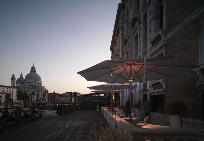Die Terrasse des fünften Stocks und ein kleinerer Aufsatz darüber sind extrem vielseitige Atemflächen des Gebäudes, die für Begegnungen, Empfänge, Arbeit und Freizeit verfügbar und eingerichtet sind. Diese beiden Bereiche unter freiem Himmel sind wegen des privilegierten Blicks auf die Lagune und wegen ihrer Größenordnung, die einem öffentlichen Platz gleichkommt, ein Ort von enormem landschaftlichem und architektonischem Wert. Auf der Terrasse ergibt sich mehr als an jedem anderen Ort von Cà Giustinian die Notwendigkeit, eine funktionelle Beleuchtung mit einer Lichtwirkung zu kombinieren, die dem Zauber und der Einmaligkeit des Orts Rechnung trägt.