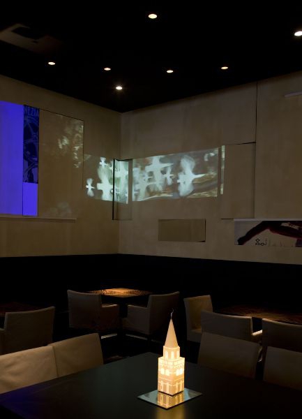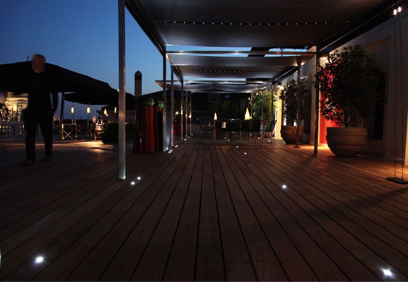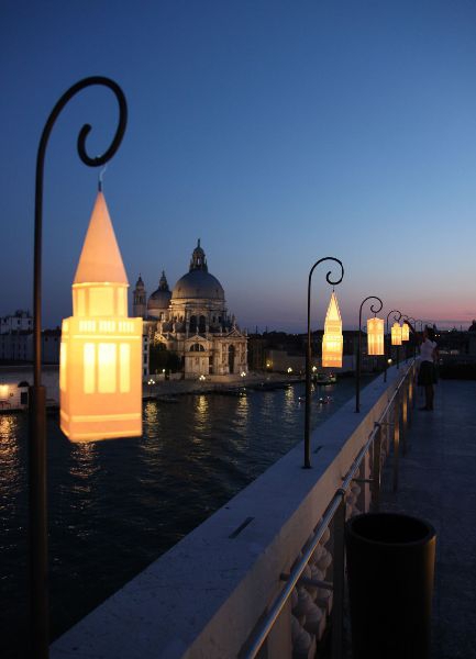 Die Absicht ist, die Atmosphäre mit dem Blick auf den Canal Grande, auf die Türme und Dächer von Venedig zu unterstreichen und den Kontext ‘sprechen' zu lassen, der bereits in eigenem Licht strahlt. Daher lebt die Terrasse von kleinen Akzenten, die für den Komfort ihrer Benutzer nötig sind, in absolutem Respekt vor dem Reiz, den der Kontext mit dem Zauber der Kontraste schafft. Zu diesem Zweck ist es wichtig, dass das Licht mit den Einrichtungselementen verschmilzt, ohne aufdringlich zu sein; die Lichtquelle, die diese Voraussetzung am besten erfüllt, ist die LED, die sich dank ihrer Kleinheit extrem vielseitig an ortsfeste und bewegliche Einrichtungselemente anpasst. Die LEDs der kleinen EinbauStrahler Zero, die im Holzfußboden der Terrasse verschwinden und den Weg um Tische und Sitze markieren; die in den Lichtschirm ombrella eingebauten LEDs, die direktes und indirektes Licht verbreiten können, dessen Farbwirkung und Intensität per Fernbedienung gesteuert werden kann; die LEDs, die die Laternen aus Wachspapier erleuchten, die Mario Nanni eigens für diese Terrasse entworfen hat: das sind die Kirchtürme des Lichts. Diese von Mario Nanni projektierten und von Viabizzuno produzierten Laternen aus synthetischem Wachspapier auf Sockel und Aufbau aus verchromtem Stahl sind der Form der Kirchtürme nachempfunden, die man von der Terrasse aus bewundern kann, und die besondere Bearbeitung des Papiers, das an einigen architektonischen Details durchgestanzt ist, bildet ein reizvolles Muster aus vollen und leeren Feldern, das beim Einschalten des darin untergebrachten Lichts sichtbar wird. Das durchgehende Lichtbündel projiziert die Zeichnung der Kirchturmfassaden auf die Auflagefläche. Sie wurden zum Aufhängen rings um die Terrasse entwickelt und schwanken, wenn sie im leeren Raum schweben, im Rhythmus des Windes und der Gezeiten. Aber es sind auch Handlaternen, ein ideales Licht für Wohn- und Empfangsräume. Das Leitkriterium ist der Gedanke von Giovanni Klaus Koenig zu dem für Venedig charakteristischen Licht: ‘das Mittelstarke, das im Kontrast mit dem Schwachen zum ganz Starken wird'.