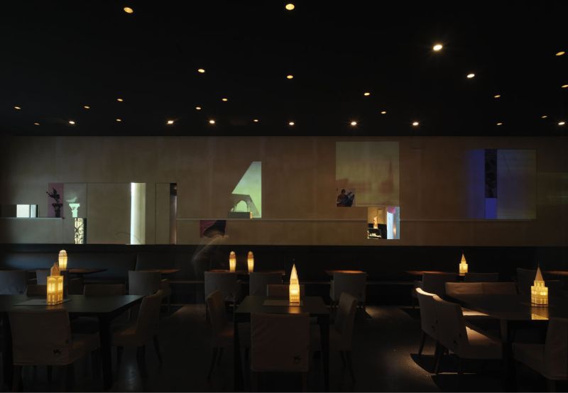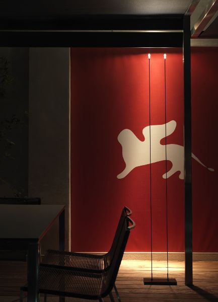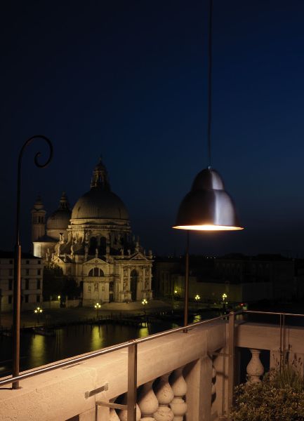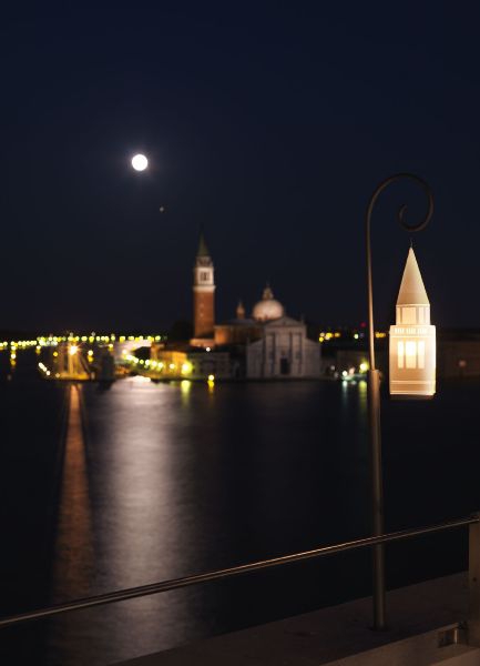 Die Absicht ist, die Atmosphäre mit dem Blick auf den Canal Grande, auf die Türme und Dächer von Venedig zu unterstreichen und den Kontext 'sprechen' zu lassen, der bereits in eigenem Licht strahlt. Daher lebt die Terrasse von kleinen Akzenten, die für den Komfort ihrer Benutzer nötig sind, in absolutem Respekt vor dem Reiz, den der Kontext mit dem Zauber der Kontraste schafft. Zu diesem Zweck ist es wichtig, dass das Licht mit den Einrichtungselementen verschmilzt, ohne aufdringlich zu sein; die Lichtquelle, die diese Voraussetzung am besten erfüllt, ist die LED, die sich dank ihrer Kleinheit extrem vielseitig an ortsfeste und bewegliche Einrichtungselemente anpasst. Die LEDs der kleinen EinbauStrahler Zero, die im Holzfußboden der Terrasse verschwinden und den Weg um Tische und Sitze markieren; die in den Lichtschirm ombrella eingebauten LEDs, die direktes und indirektes Licht verbreiten können, dessen Farbwirkung und Intensität per Fernbedienung gesteuert werden kann; die LEDs, die die Laternen aus Wachspapier erleuchten, die Mario Nanni eigens für diese Terrasse entworfen hat: das sind die Kirchtürme des Lichts. Diese von Mario Nanni projektierten und von Viabizzuno produzierten Laternen aus synthetischem Wachspapier auf Sockel und Aufbau aus verchromtem Stahl sind der Form der Kirchtürme nachempfunden, die man von der Terrasse aus bewundern kann, und die besondere Bearbeitung des Papiers, das an einigen architektonischen Details durchgestanzt ist, bildet ein reizvolles Muster aus vollen und leeren Feldern, das beim Einschalten des darin untergebrachten Lichts sichtbar wird. Das durchgehende Lichtbündel projiziert die Zeichnung der Kirchturmfassaden auf die Auflagefläche. Sie wurden zum Aufhängen rings um die Terrasse entwickelt und schwanken, wenn sie im leeren Raum schweben, im Rhythmus des Windes und der Gezeiten. Aber es sind auch Handlaternen, ein ideales Licht für Wohn- und Empfangsräume. Das Leitkriterium ist der Gedanke von Giovanni Klaus Koenig zu dem für Venedig charakteristischen Licht: 'das Mittelstarke, das im Kontrast mit dem Schwachen zum ganz Starken wird'.