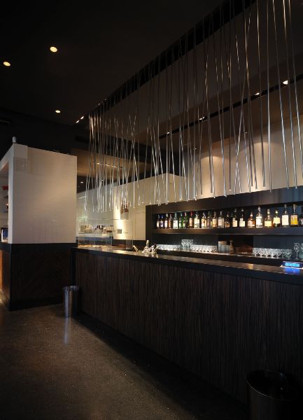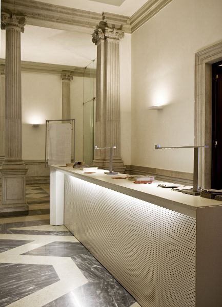 Alle Büros werden je nach Größe des Raums und Zahl der Arbeitsplätze auf besondere und individuelle Weise mit einem System beleuchtet, das aus Profil, Zubehör und Verkabelung kombiniert ist und sich wiederholt, ohne aber je gleich zu sein. Jedes Stockwerk von Cà Giustinian hat eine große, zentrale Verteilerhalle, das Herz des Palazzo, das sich für jede unterschiedliche Stockwerkssituation wiederholt. Die Beleuchtung dieses Raums erfolgt mit Wandleuchten quasi aus weißem Metall; die Lichtquelle ist eine nach oben gerichtete Halogenlampe von 200 W; der Neigungswinkel kann mit Hilfe einer manuellen Klappe verstellt und das Licht gedimmt werden. Für die Beleuchtung der Durchgangs- und Verteilerkorridore, für Wirtschafts- und Toilettenräume wird der Leuchtkörper net in den Versionen net muro und net p.s. benutzt, er ist aus glänzendem Edelstahl und mit Leuchtstofflampen vom 3000°K verkabelt. Die Länge des Leuchtkörpers variiert ja nach Größe des zu beleuchtenden Raums, er verteilt ein diffuses Licht erzeugt auch Lichtakzente an den Wänden, um das Auge zu neuen Blickpunkten zu lenken.
