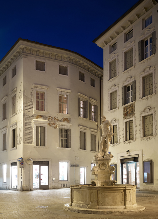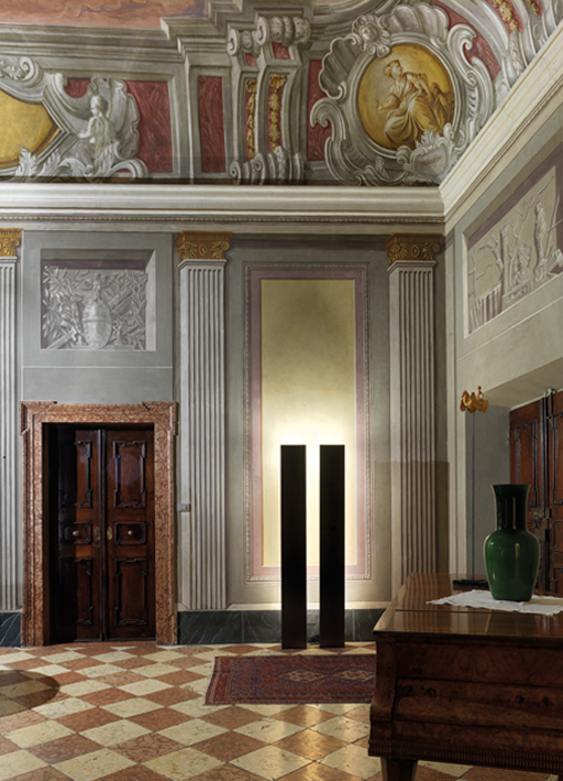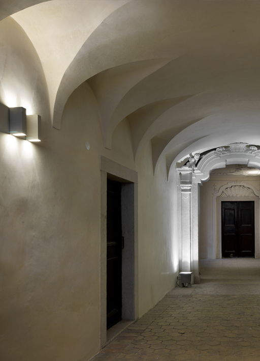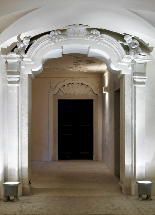 Das Licht, eine bestimmte Art von Licht, präzis, klar, unverwechselbar, unaufdringlich, dieses besondere Licht, das, wenn es gut gewählt und gut ausgerichtet ist, den Raum besser erkennen lässt, hat uns auch in diesem Fall das Erlebnis verschafft, die elegante Architektur des Palazzo Candelpergher in Rovereto aus dem 17./18. Jahrhundert richtig zu sehen und zu würdigen. Der Palazzo liegt an der Ecke der kleinen Piazza delle Oche, in deren Mitte der steinerne Neptunbrunnen von 1736 steht. Die Restaurierung der Fassaden und des Dekors, die kürzlich vom Büro des Architekten Paolo Baldessari durchgeführt wurde, hat einige interessante Spuren von Malereien ans Licht gebracht, Reste einer umfangreicheren Dekoration, die architektonische Elemente wie Bossen, Lisenen, Kapitelle und Fialen illusionistisch nachahmen. Besondere Aufmerksamkeit verdienen ein auffälliges Wappen und ein fein ausgearbeitetes dreifarbiges Diamant-Ziermotiv in Schwarz, Grau und Weiß, das die Ecke des Palazzo unterstreicht und ursprünglich bestimmt spektakulär war, weil sich an den dunkleren Feldern kleine konvexe Rundspiegel von der Größe einer Münze befanden, die das magische Licht des Tages und der Sonne einfingen und reflektierten. Das malerische Dekor wird durch falsche Marmorlisenen mit gekehlten Kapitellen vervollständigt, die weite Felder einrahmten, deren Ausmalung eine dichtes und regelmäßiges isodomes Mauermuster aus bossierten Backsteinziegeln vortäuschte, die mit ihrer lebhaften Orangefarbe dem Ganzen eine einmalige und besondere Leuchtkraft verleihen sollten. Den umfangreichen Restaurierungsarbeiten an den Fassaden und am Dekor folgten, unter der glücklichen und sensiblen Leitung der jungen Architekten Marco Malossini und Gianmaria Incerti, Arbeiten an einigen repräsentativen Innenräumen des Palazzo. Insbesondere wurden die Stuckverzierungen des leichten Rokoko-Dekors der breiten Prunktreppe konsolidiert und auf den alten Glanz gebracht, an der die mit eleganten Pfosten aus rotem Stein oder einheimischem grauem Stein gerahmten Türen stehen, über denen sich plastische Rocaille-Motive aus Gips ranken. Die architektonische Qualität dieser Räume, die sich nach gründlicher manueller Beseitigung der Übermalungen, Konsolidierung für die Wiederanbringung von Verputzstücken am Mauerwerk, Ausfüllung der fehlenden Teile mit Stuck, Farblasierungen auf Kalkbasis zum Ausgleich der Unregelmäßigkeiten des Auftrags und Wiederherstellung der einfarbigen Weiß- auf Weiß-Bemalung zeigte, wurde durch Wandleuchten clv2 large a biemissione mit zwei Lichtquellen unterstrichen, während das außergewöhnliche Gipsportal mit Kopien von Konsolen tragenden Putten zwischen der Eingangshalle und der breiten, eleganten Treppe mit am Boden angebrachten big feet großartig zur Geltung gebracht wurde. Die Beleuchtung des polychromen Salons im Hauptgeschoss wurde einer langen Reihe von Doppelstehlampen notte mit Antik-Messingfinish anvertraut, die wegen der beiden verschiedenen Lichtquellen, die sie bieten, optimal sind: Streulicht nach oben, um die Farbgebung der allegorischen Szenen des flachen Deckengewölbes herauszuarbeiten, und ein ungerichtetes homogenes Licht, das die Pigmentierung der Farben nicht verändert. Wieder einmal hat sich notte als die Lösung für die Beleuchtung von komplexen, geschichtsträchtigen Räumen bewährt, wie es dieser Salon ist, der, obwohl durch verschiedene Ausführungstechniken und Stile gekennzeichnet (das Deckengemälde wird auf das 18. Jahrhundert datiert, die Tempera-Wandbemalung auf das 19. Jahrhundert), eine sehr originelle und inhaltsreiche Komposition von Malereien aufweist: Über den sechs Türen des Salons sind in Rechtecken die Reihe der Tugenden dargestellt, mit Leben, Wachsamkeit, Klugheit und Tapferkeit, symbolisiert durch den Hahn, Stärke und Weisheit, symbolisiert durch die Eule, die Reihe der Mäßigung mit Weisheit und Gerechtigkeit, symbolisiert durch Bücher und Lesepult bzw. Waage, Szepter und Krone, und die Reihe der bildenden Künste und der Musik, symbolisiert durch Skulptur und Stillleben bzw. Leier und Trompeten.