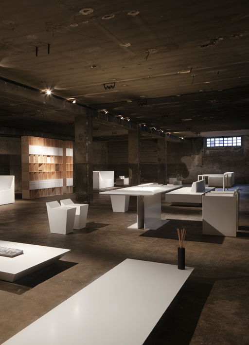 Das Raster des Erdgeschosses, das auch im Untergeschoss aufgegriffen wird, bestimmt die Anordnung der Produkte mit ihren reinen Formen und Farben, die zu absoluten Hauptdarstellern werden, hervorgehoben durch Lichtbündel, die das Auge des Besuchers leiten und eine theatralische Raumwirkung erzeugen. Die Dualität der einander gegenübergestellter Welten ist eine Antwort auf die Notwendigkeit und Funktionalität der Räume. Das Untergeschoss zeigt in seiner Isolation seine dauerhafte Unbeeinflussbarkeit, das Erdgeschoss unterstreicht mit seinen Änderungen und Wechseln und dank dem Licht, das seine Atmosphäre jeden Augenblick modifiziert, die stofflichen Erfahrungen der Forschung. Das Ganze wird umrahmt vom Reiz des Freigeländes, das Installationen bedeutender zeitgenössischer Designer zeigt und bei Sonnenuntergang mit Hilfe künstlicher Lichtpunkte zum Schauplatz eines Spiels von verführerischen optischen Suggestionen wird.