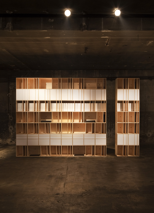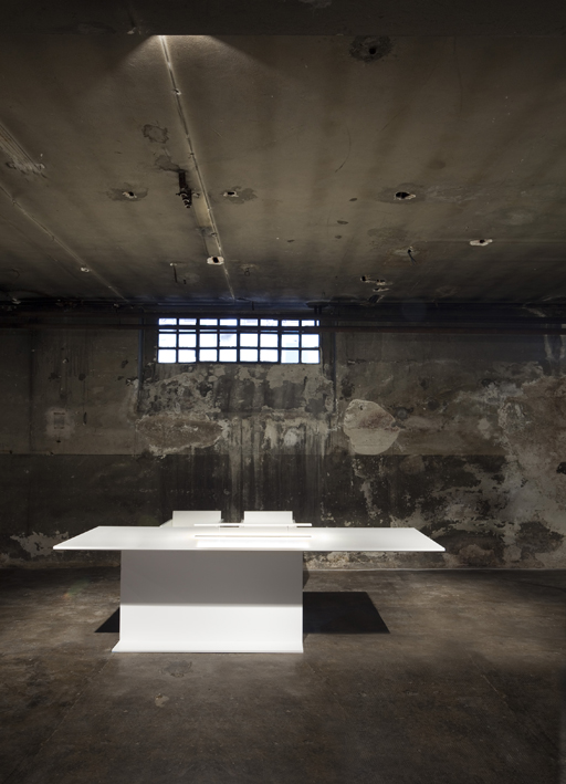 Den zwischen den Gebäuden des zwanzigsten Jahrhunderts versteckten Ausstellungsraum erreicht man, indem man im Hof über einen architektonischen Promenadenweg geht, der durch unterschiedliche natürlich-stoffliche Empfindungen gekennzeichnet ist; das Ganze ist als Willkommensgruß in einer exklusiven Welt angelegt. Der absichtlich schmale Eingang und der anschließende Flur engen den Blick des Gastes ein, um ihn dann mit einem weiten, lichtvollen, reinen Raum zu überraschen: Der Ausstellungsraum zeigt eine Dualität, die die beiden Haupträume kennzeichnet, zwei entgegengesetzte Welten für zwei verschiedene Funktionen. Das Erdgeschoss erstreckt sich entlang der natürlichen Linien zwischen den Fenstern, den Pfeilern und den Oberlichten, die ein dreidimensionales Raster bilden und zur Führungslinie für die Anbringung der Objekte und das Herstellen von Labor-Abteilungen werden. Es handelt sich um einen durchscheinenden Raum, modelliert vom natürlichen Licht, das von den großen Industriefenstern und von den Oberlichten kommt, und vom künstlichen Licht, das fortlaufend und gleichmäßig zwischen der Mauer und der Bank angebracht ist und die monumentale Ausdehnung des 35 Meter langen Raums unterstreicht. Das Licht in der Mitte dieses Raums folgt parallel der Linie der Bank und erzeugt eine Lichtschiene, die ebenfalls zur Hervorhebung der Längsausdehnung des Raums und des Wegs beiträgt.