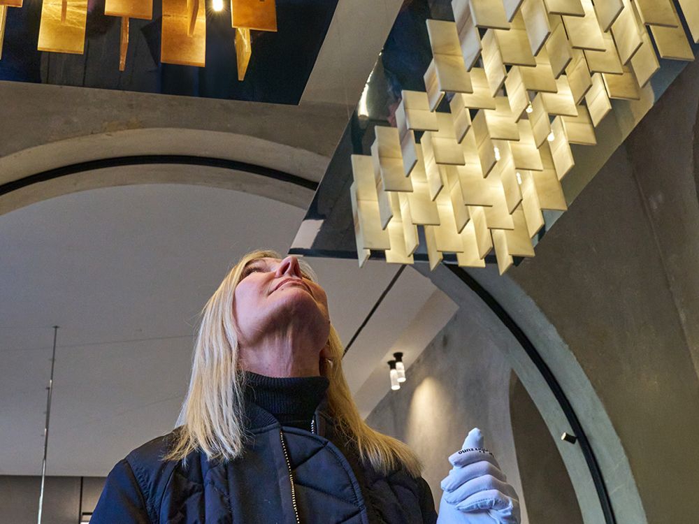 ‘when we design spaces, we always work with both daylight and artificial light in relation to a defined surface. light and materiality are deeply interconnected. without a material to catch, reflect, or diffuse it, light has no real spatial presence. creating an immersive experience of this interplay between light and materiality was a central thought, when we developed the concept for the chandelier with Viabizzuno. here, the rhythm of the stones emphazises the interplay between light and materiality. and the thin aluminium plate creates a sense of buoyancy, making the stones appear as if they are floating in midair. when light hits the onyx it diffuses through its translucent surface, accentuating the intricate veining and subtle tonal variation, revealing the stone’s natural layers and warmth. the experience is both tactile and visual’.