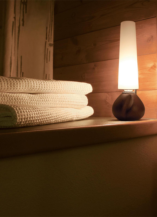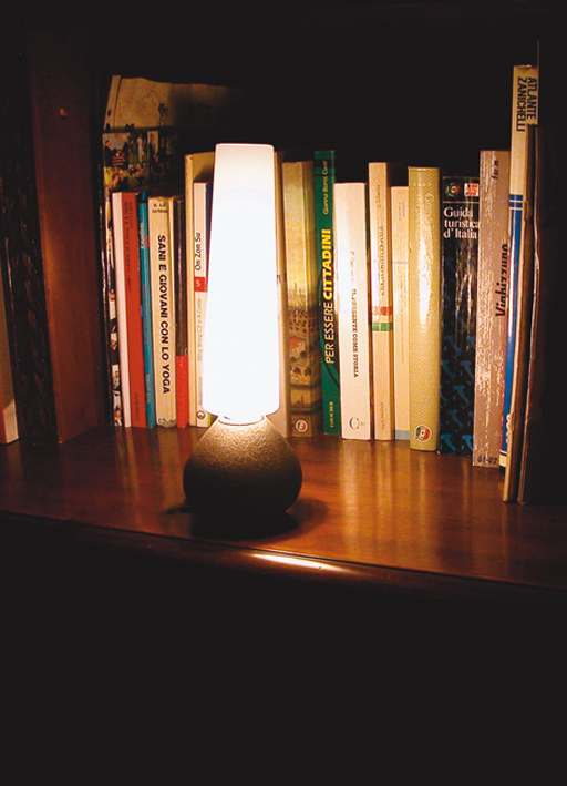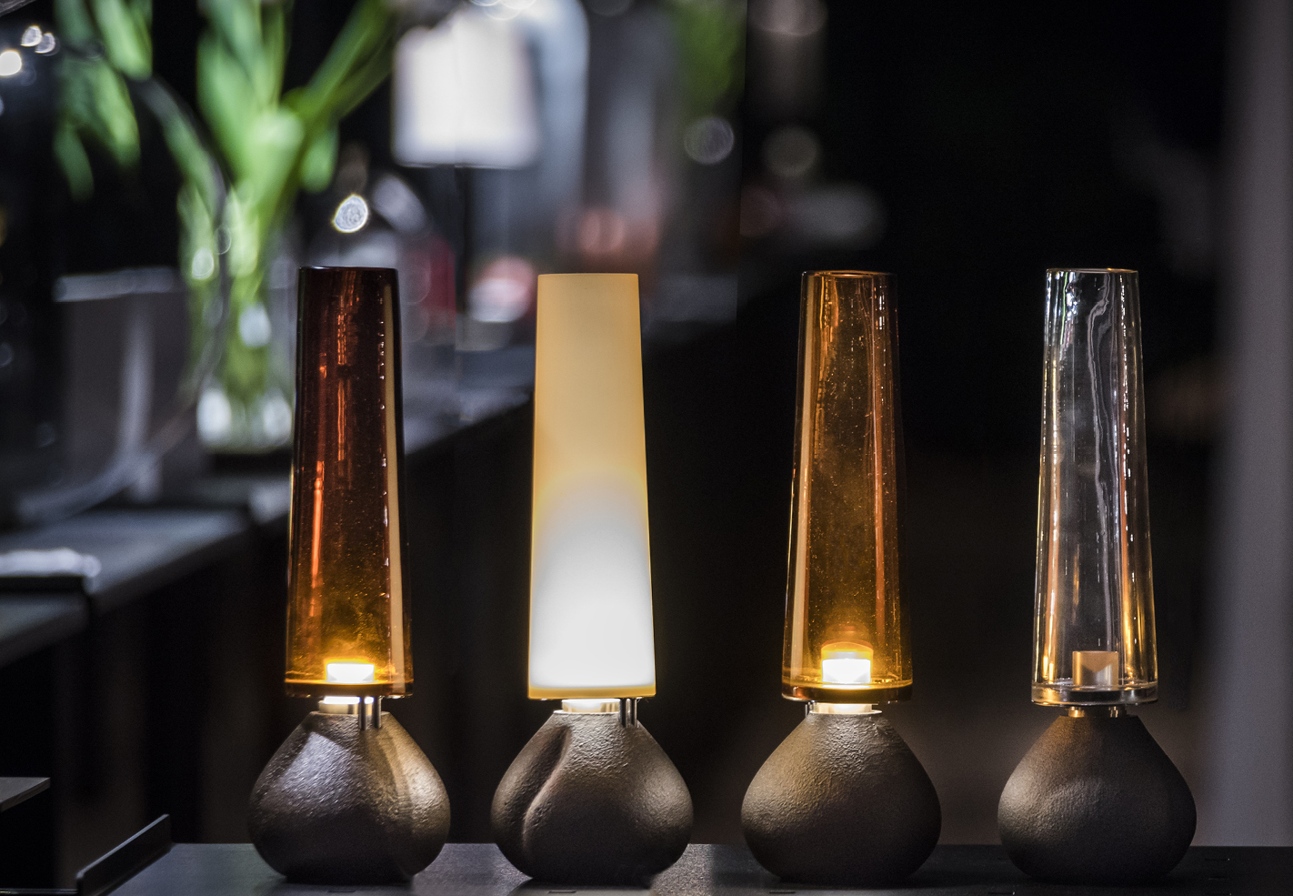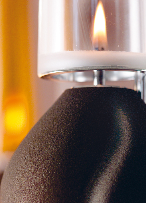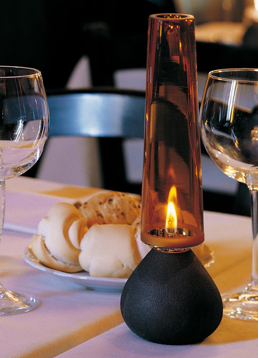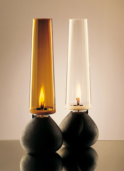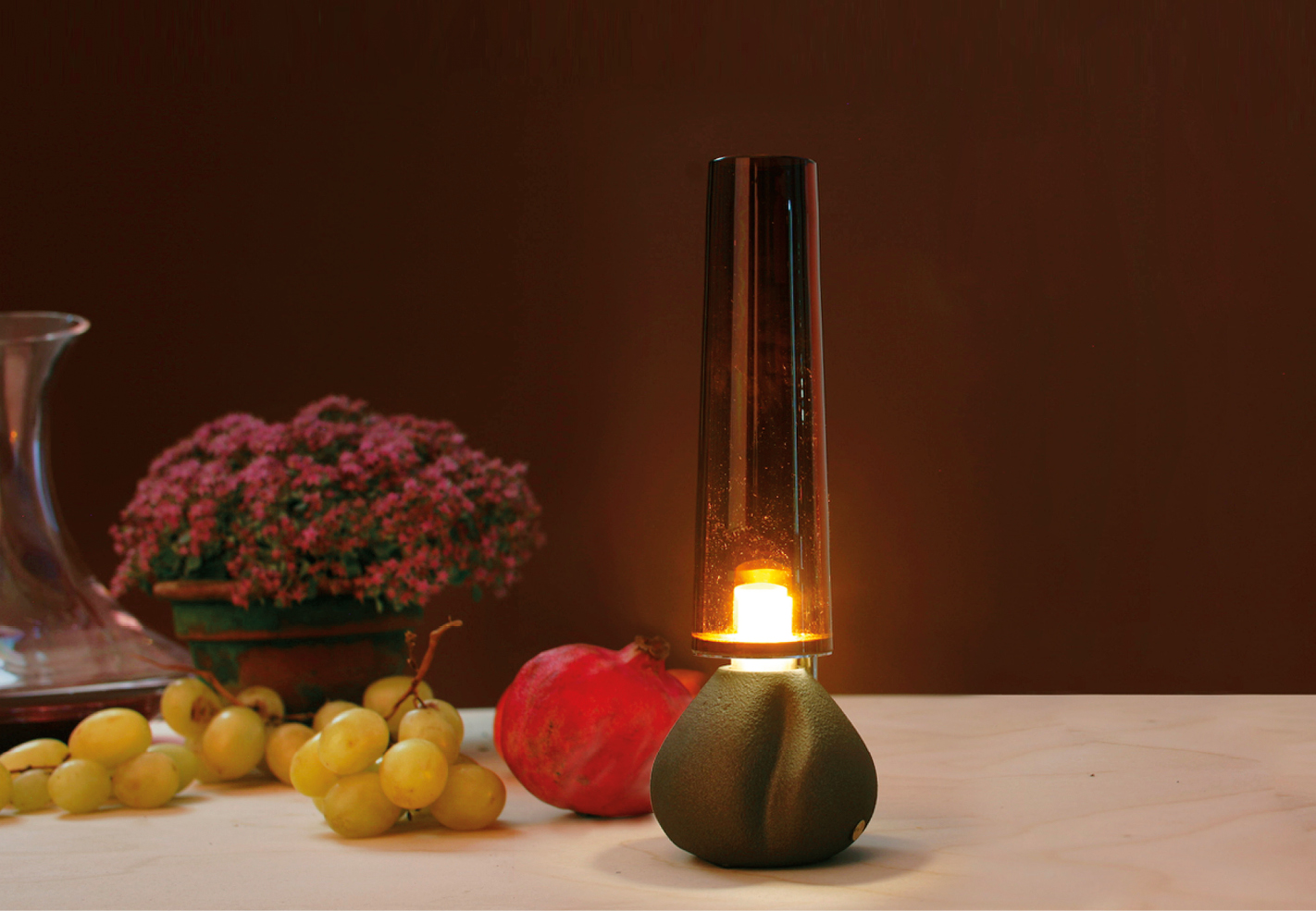 IP20 rated table light fitting for indoor use. made of a painted iron casting base and a flashing handmade blown glass diffuser. any irregularities in the glass are a guarantee of an unique product, blown and entirely hand crafted by master glassmakers. versions: mon amour elettrica supplied with cable with plug and 220-240V 50-60Hz power supply, mon amour batteria with touch switch and 220-240V 50-60Hz battery charger included, mon amour olio with refill tank. mon amour elettrica and batteria are wired with 2700K led source 2.5W 240lm. battery life 6 hours, charging time 14 hours. accessories: wall support, 100 ml/1l oil refill. finishes: rust brown base, white, amber, transparent and cognac glass.