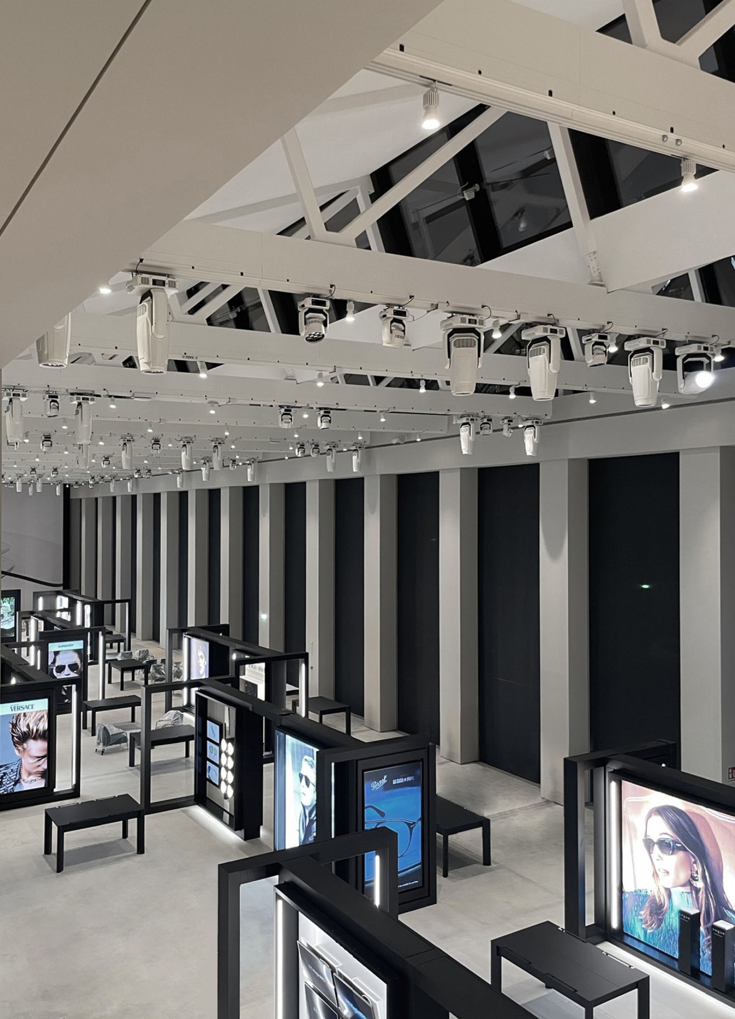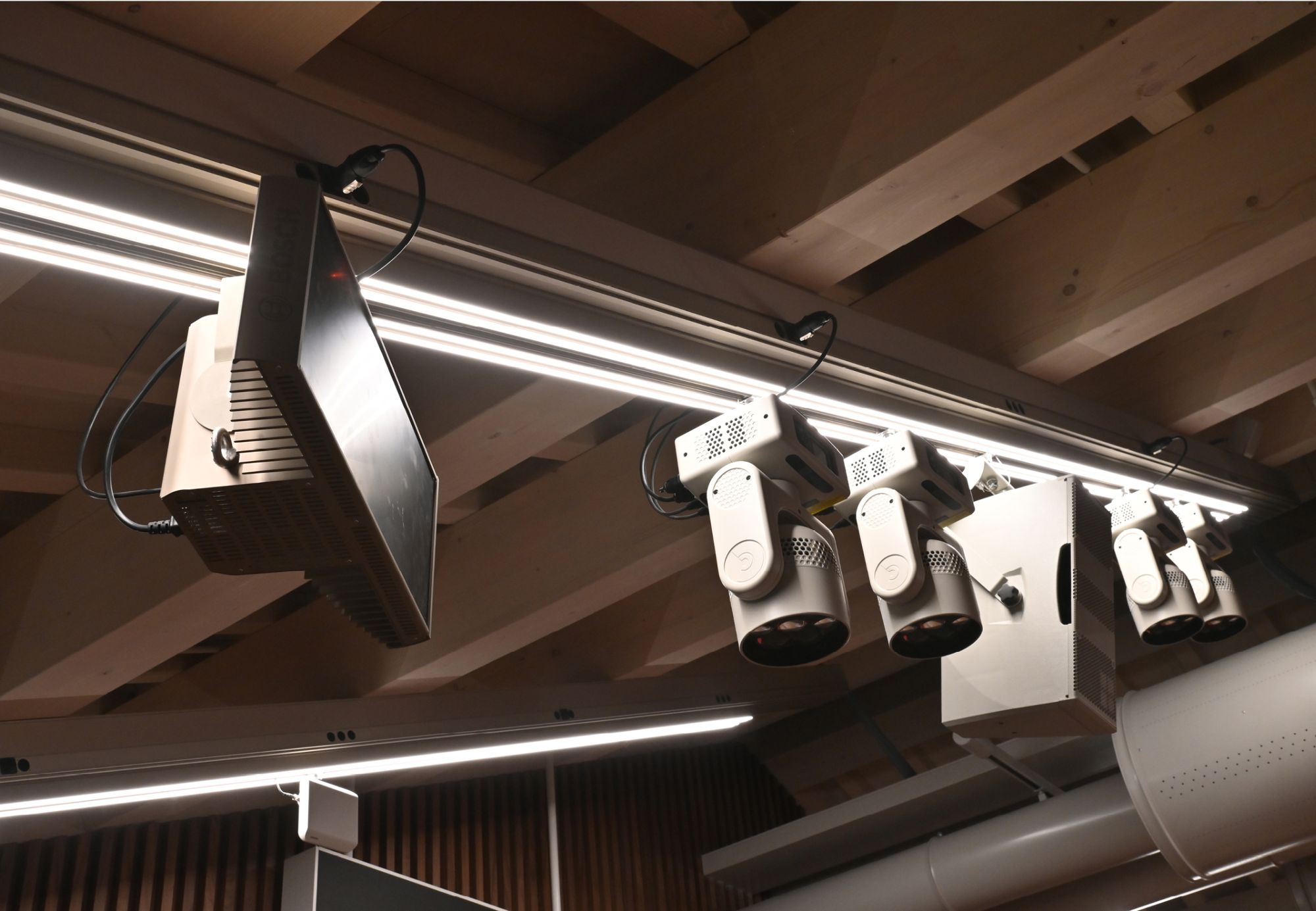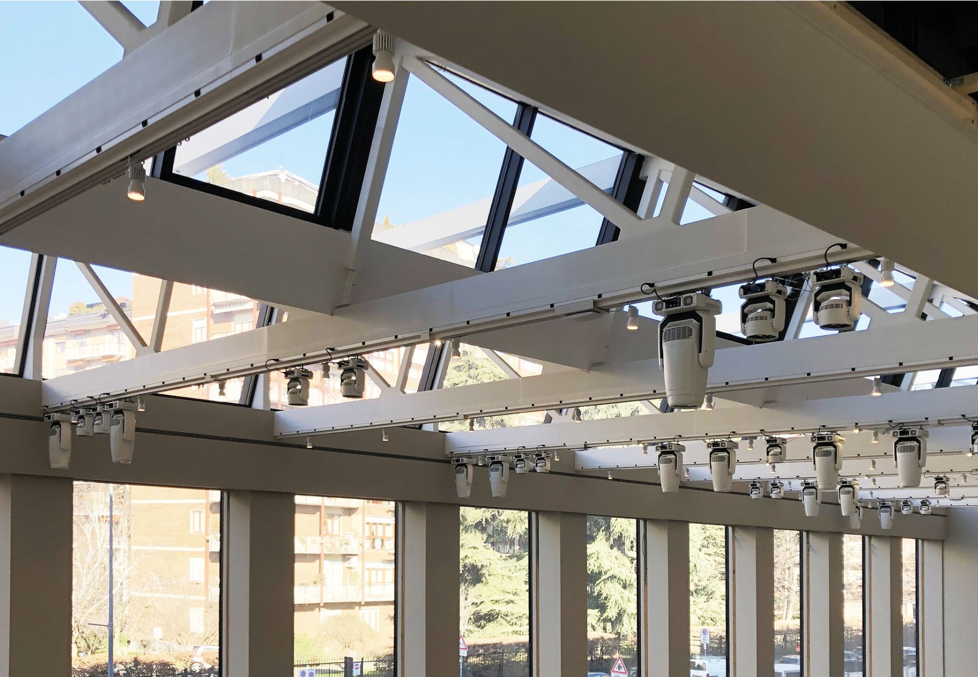 through movable trolleys and mechanical couplers integrated with A10 and A11 tracks, the anchoring and handling of loudspeakers, screens and fixtures for commercial lighting.