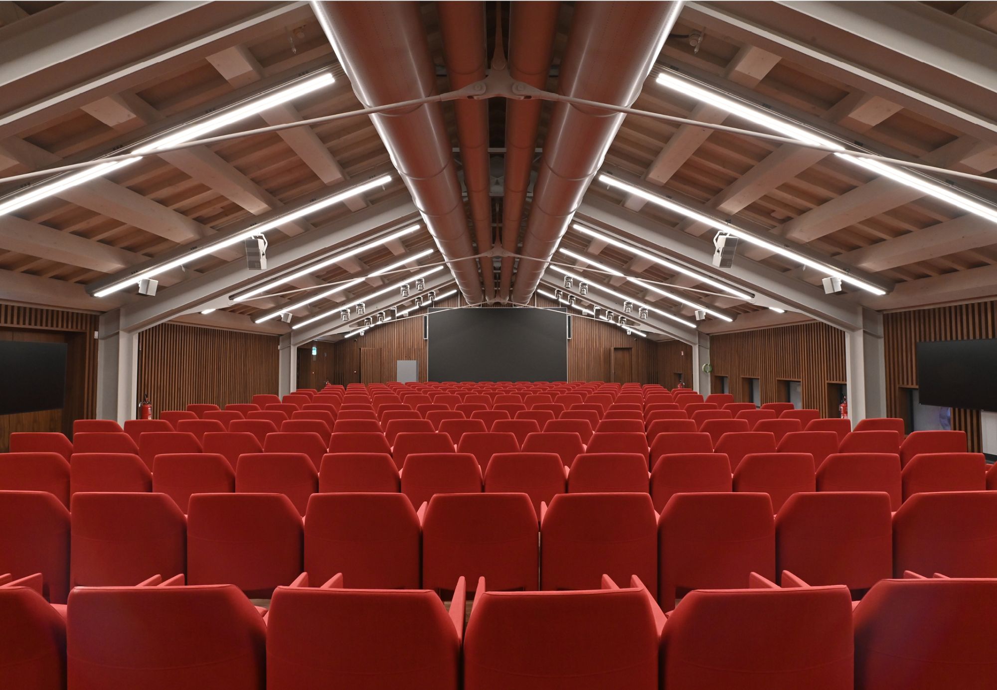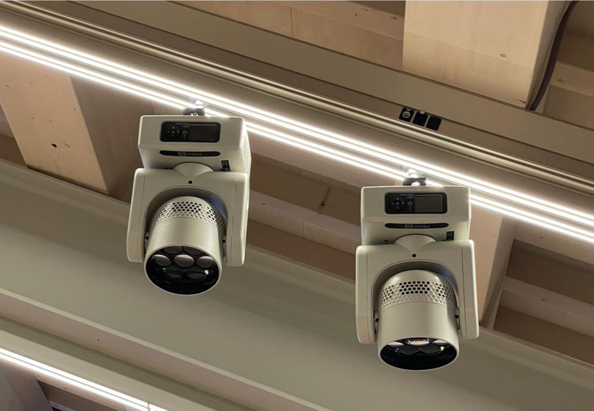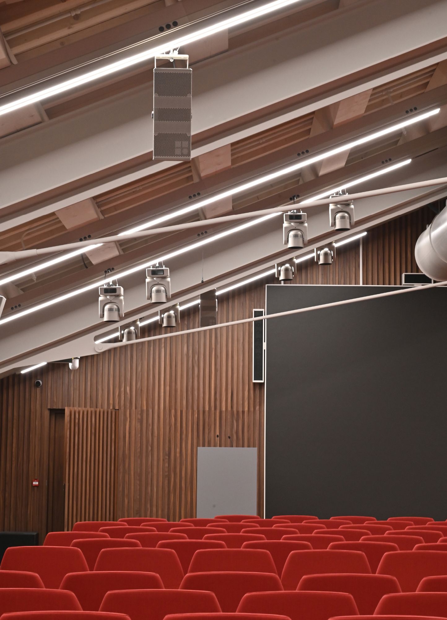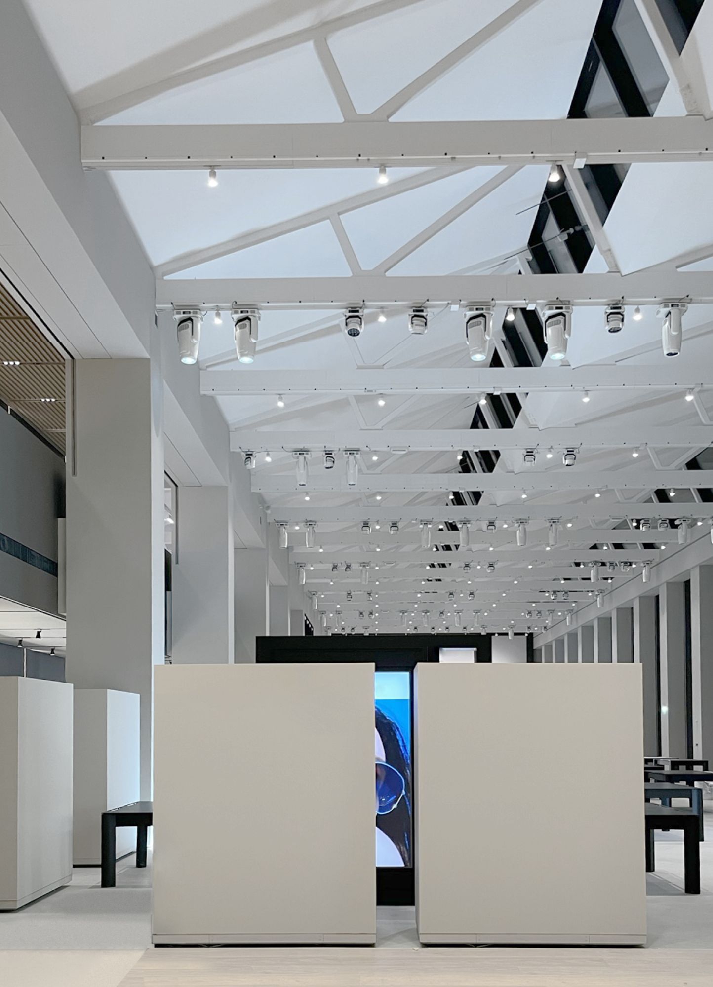 through movable trolleys and mechanical couplers integrated with A10 and A11 tracks, the anchoring and handling of loudspeakers, screens and fixtures for commercial lighting.