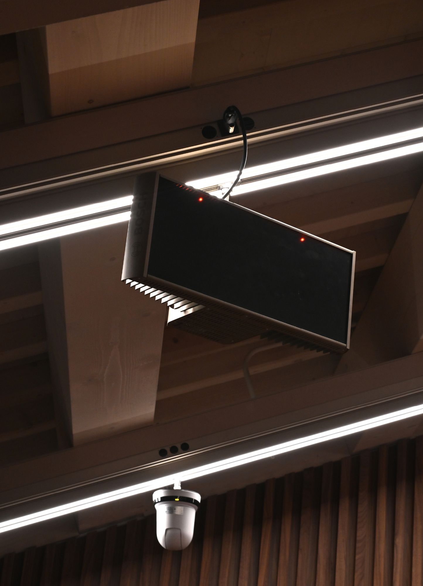 IP20-rated multifunctional ceiling and suspension system for indoor use made from extruded 99x131.5x3000mm oxidized aluminum designed to be a supporting structure and communication infrastructure for lighting, data, power systems, scenographic and acoustic systems.