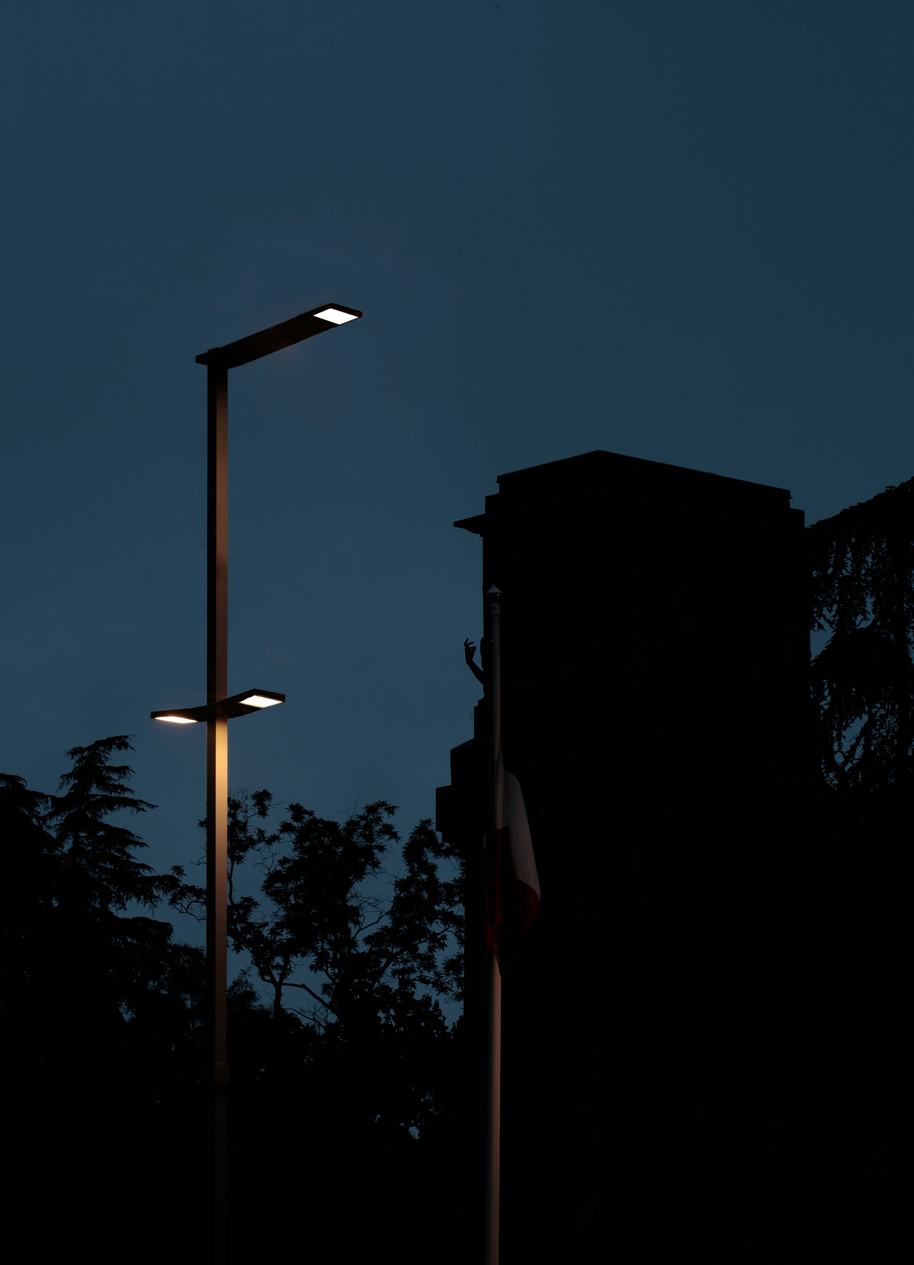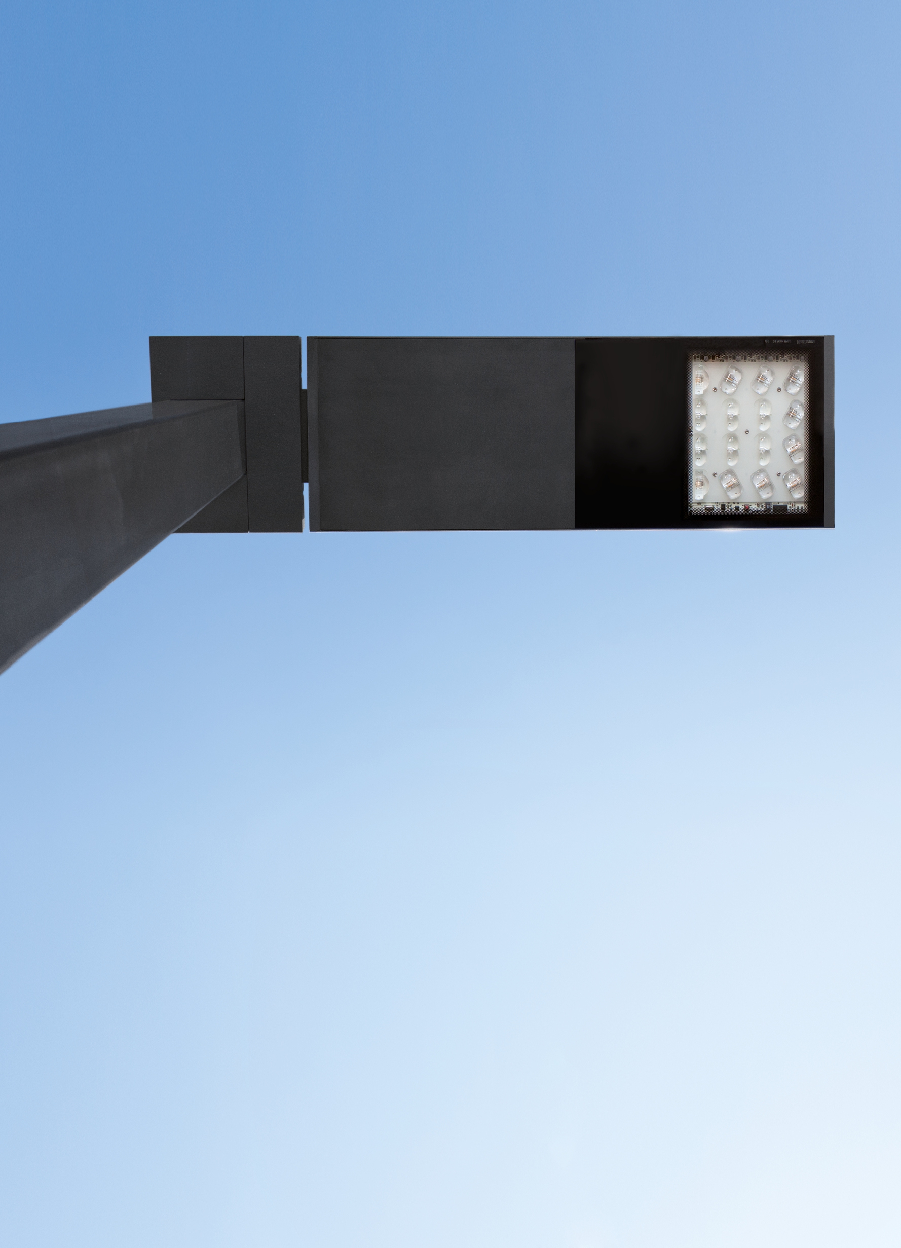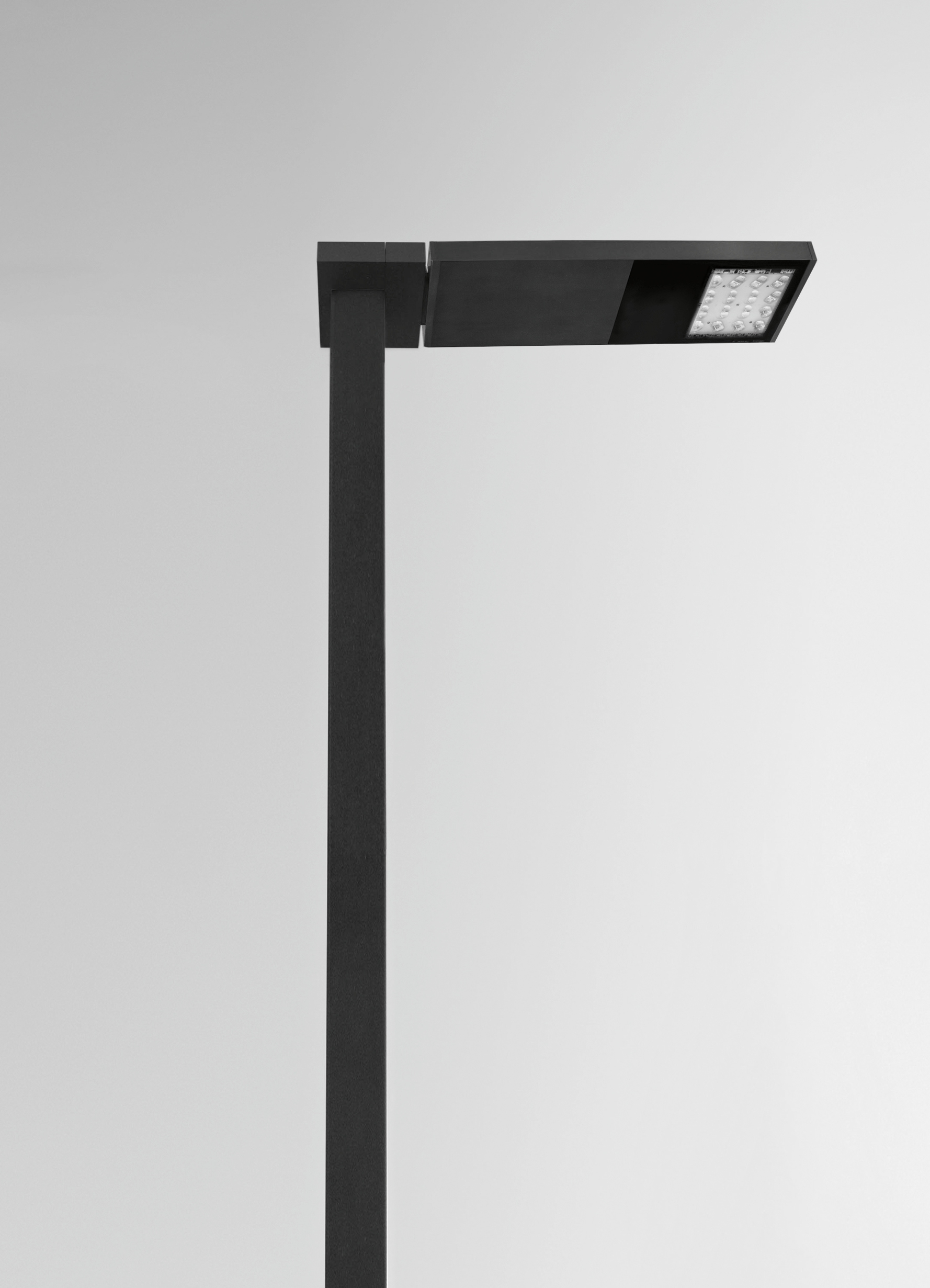 made of oxidised aluminium extrusion, which can be mounted on a hot galvanised and powder polished pole with 80x80mm section or on a wall by using specific components.