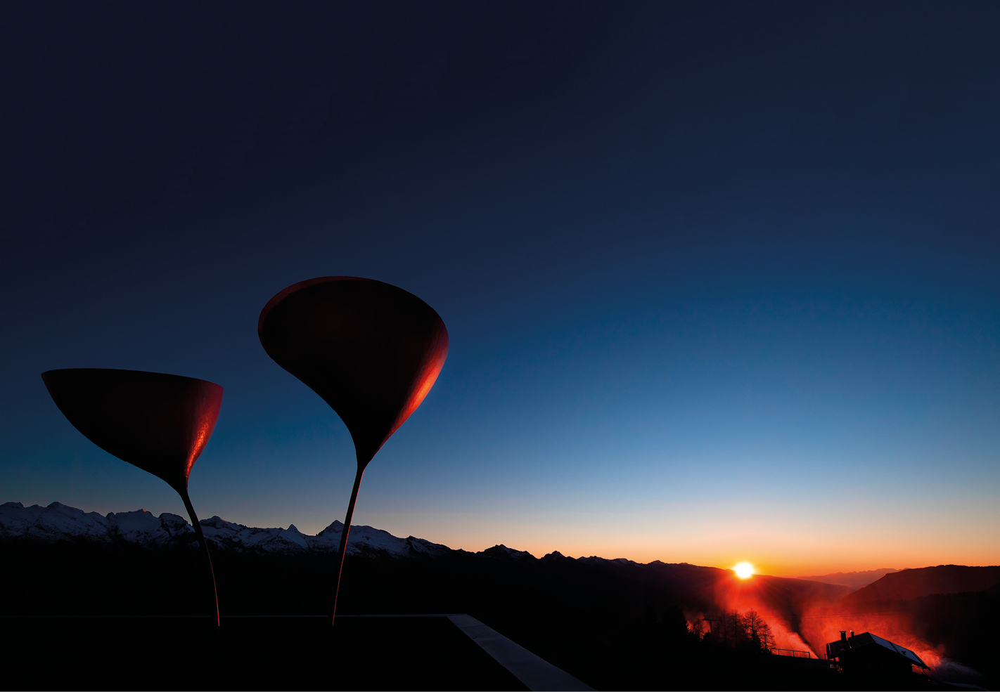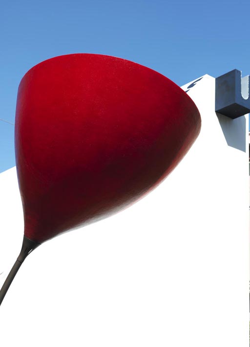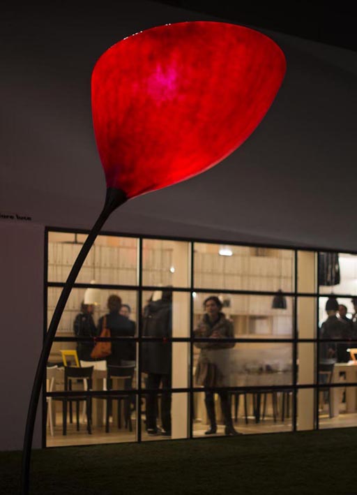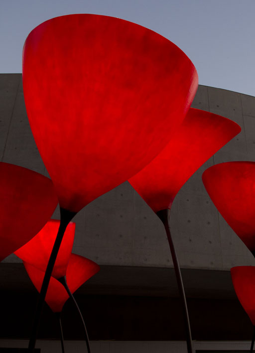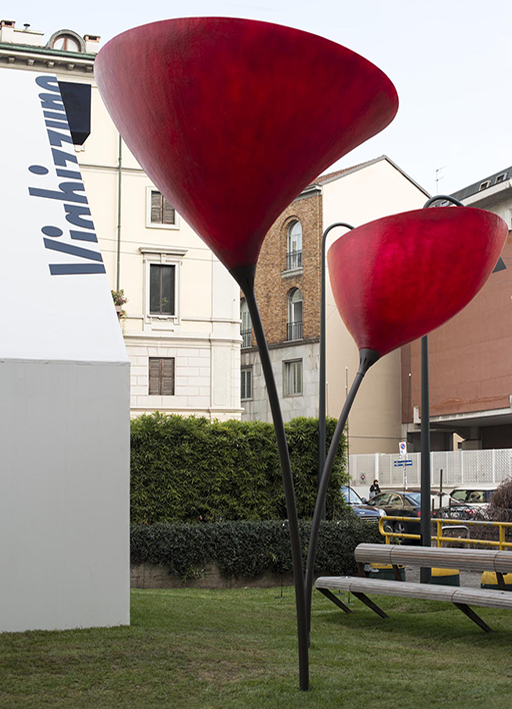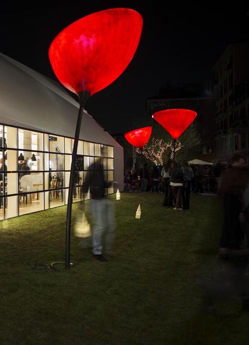 IP65 floor standing light fitting for outdoor use made of a fibreglass diffuser fitted to a powder coated steel pole, to be fixed to a special 535mm high steel ground anchor. versions: maxxi poppy 01 with 1800x2050mm elliptical section, a height of 4350mm above ground, wired with 3000K 69.7W 9633lm source, maxxi poppy 02 with 1610x1590mm elliptical section, a height of 3930mm above ground, wired with 3000K 69.7W 9633lm source, poppy 03 with 840x760mm elliptical section, a height of 2040mm above ground, wired with 3000K 34.2W, 5253lm source, 240V 50Hz power supply not included, to be installed in a special cable draw pit. finishes: red fibreglass, antique brown pole.