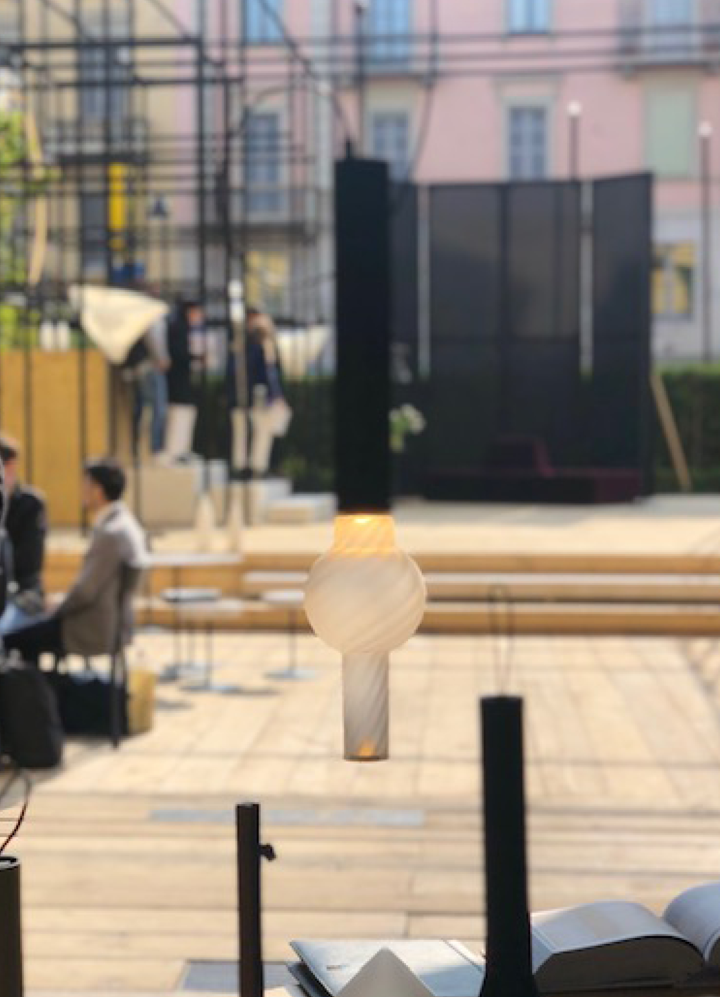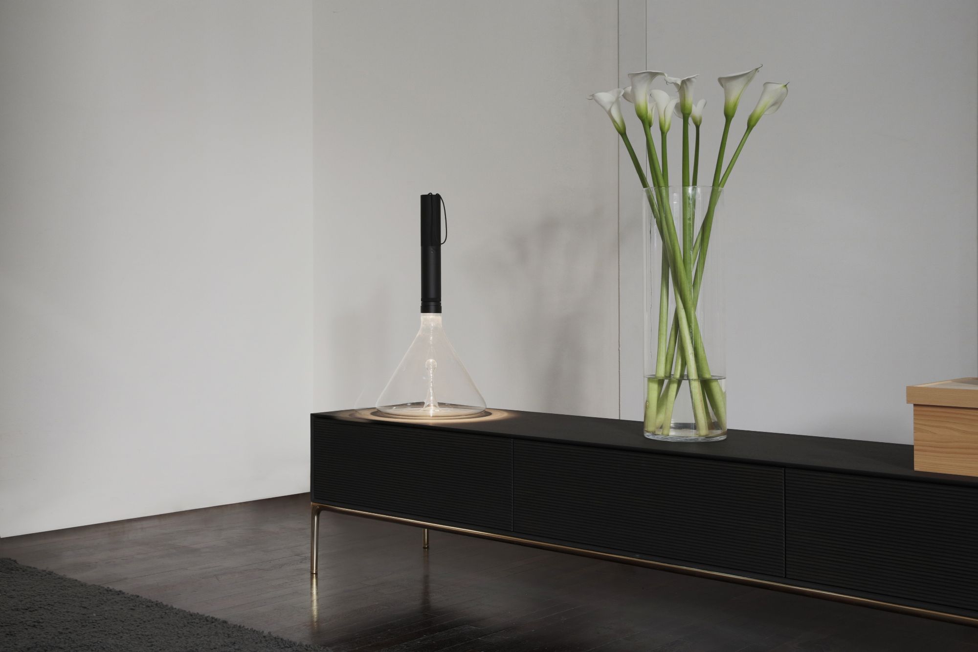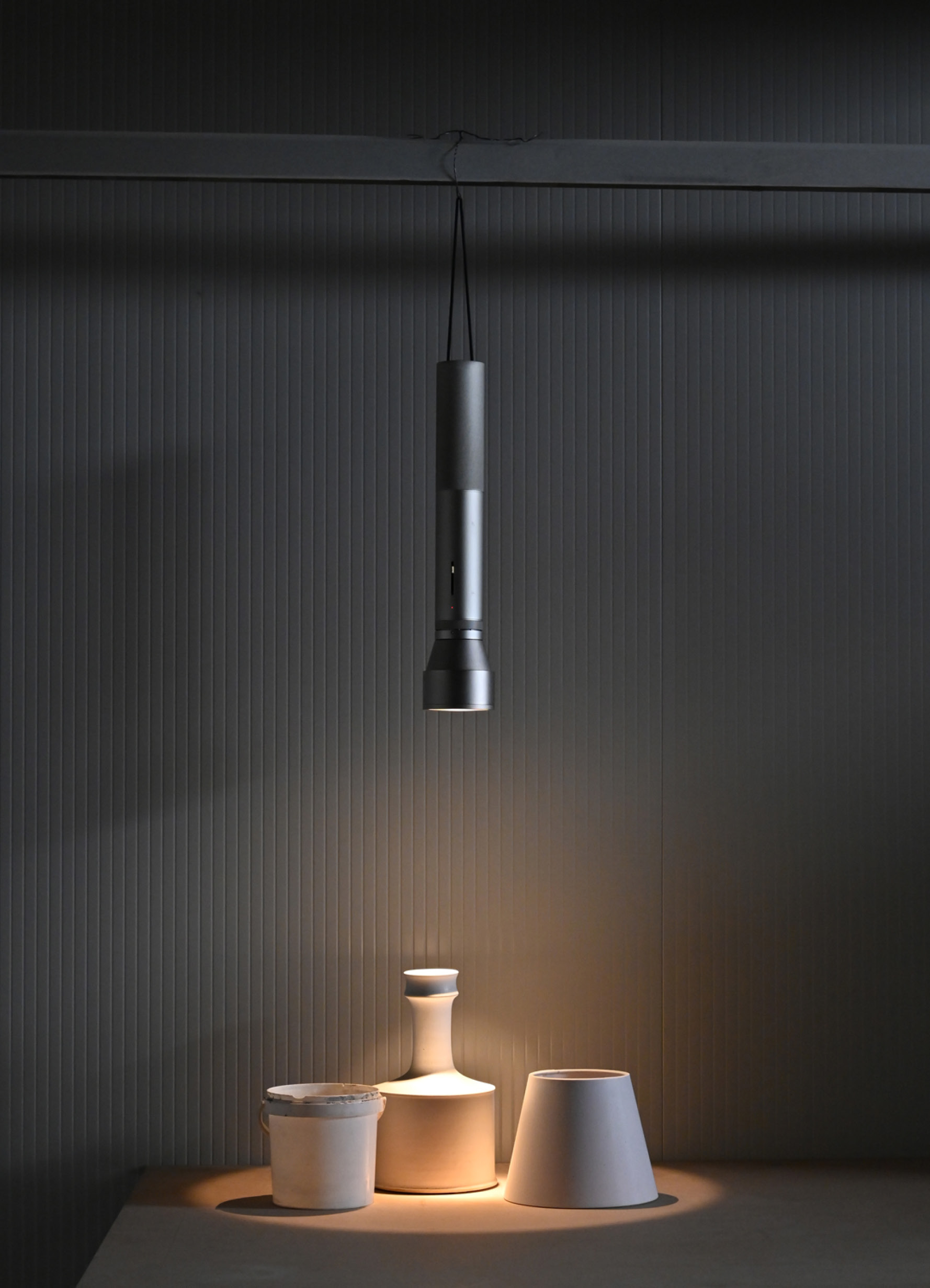 made of oxidised aluminium, it consists of a frosted cylinder acting
