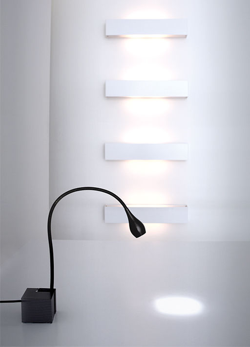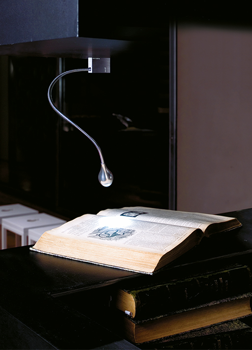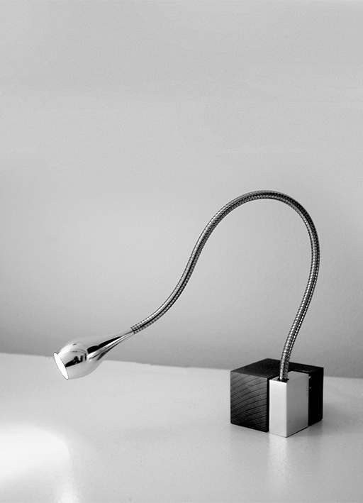 made of oxidised aluminium, it consists of a head with the light source and a flexible rod having a length of 200 mm that can be adjusted in every direction.