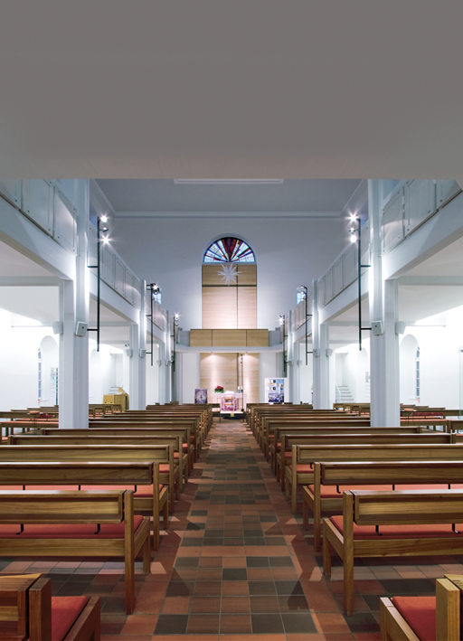 the mosaico fittings enabled the light coloured columns of the nave to be used as reflective surfaces for the fluorescent tubes, while the spotlights with QR111 lamps, fitted into the same fittings, light the church pews. the height calculated for the installation was based on the proper balance to be created between an accentuating and evocative light suitable for religious celebrations and one that was uniform and precise as required for reading.