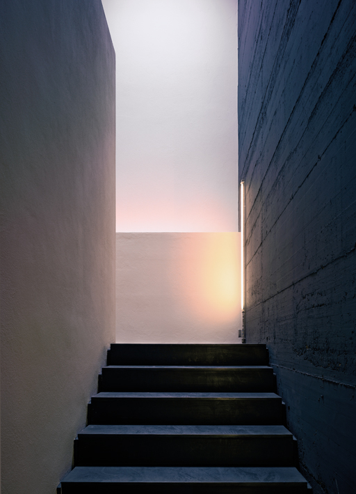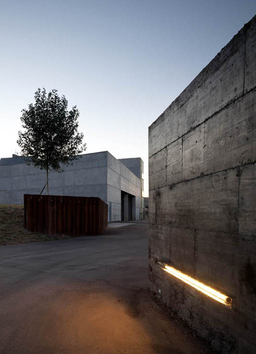the light for the outdoor is oblique on the floor and contributes to underline the monumentality of the cement walls. the surrounding fence has been conceived as an ornament; at the same time, they made it suit the backgroud with a frame of wire netting and floors made of labelled asphalt.