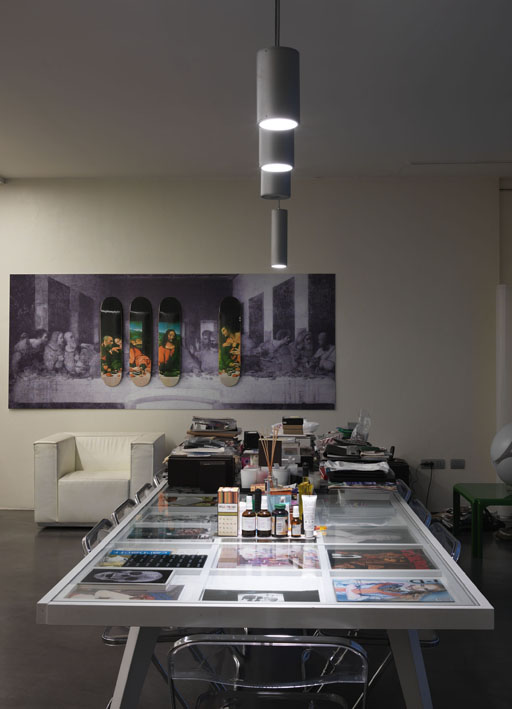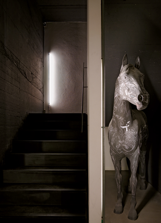 the lighting of the building, realized by Viabizzuno, followed the project step by step and satisfied the requirements, putting itself in the service of an architecture that is never completely finished. it is a volume open to new experimentations. in the offices, they chose ceiling tracks with adjustable spotlights that shape the outlines of a flexible space, in hold, available to new destinations of use. for the transit areas and the stairs, the light has been conceived and designed to discretely facilitate the orientation, marking the borders between spaces and the silhouette of architectural volumes. in the common rooms dedicated to conviaviality – studio, playground, reading room, kitchen – the light creates a domestic atmosphere revealing objects, art fragments and installations that populate the spaces like in a collector’s house.