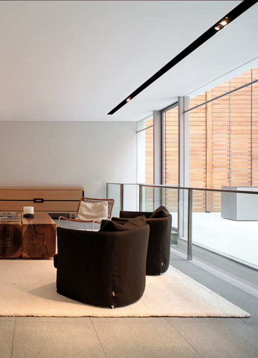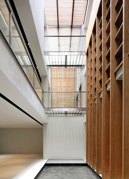 once through the entrance tunnel, the dualities in the house’s planning and language are revealed. in contrast to the cavernous entrance, the main living room is designed as a lightweight glass box that sits inside what feels like a larger garden room. this 'room' is constructed out of full double height teak strip screen walls that pivot outward like a series of majestic doors to allow the room to breathe and become one with the external spaces. the roof of this double volume room is also made of teak strips with a glass sheet above them that makes the space feel as airy and light as possible.