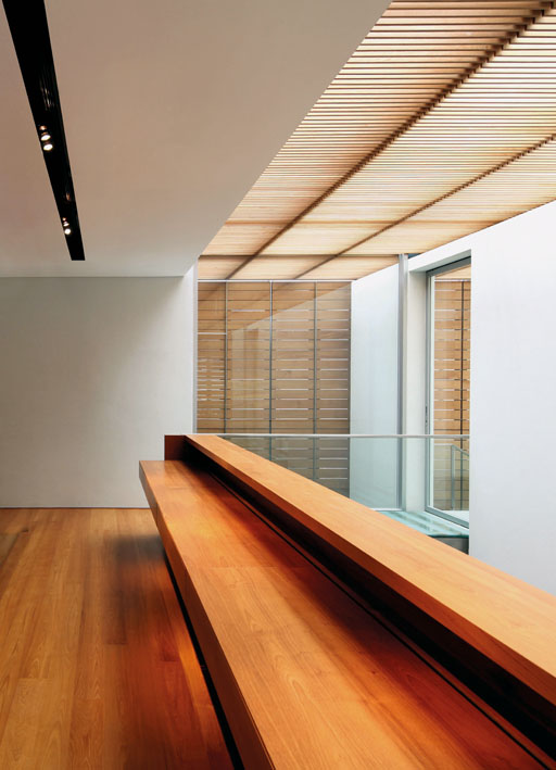 bedmar designed the glass box living room to feel like an independent floating volume within a larger timber trellised garden room. the slab of the living room floor is pulled away from the floor of the garden room, creating a gap or void into the lower level. the visitor crosses over this void on light glass-floored bridges that accentuate the separation between the two structures. toward the back of the living room, a larger void opens up to a wide courtyard space that connects up from basement level to the attic and spans between the two stone walls at the sides of the house. this courtyard is also traversed only by the delicate glass bridges at each level. the openness of this space and physical separation between forms promotes the movement of light and air through the house which is, other than the view out of to the ocean at the back, mainly internally focused.