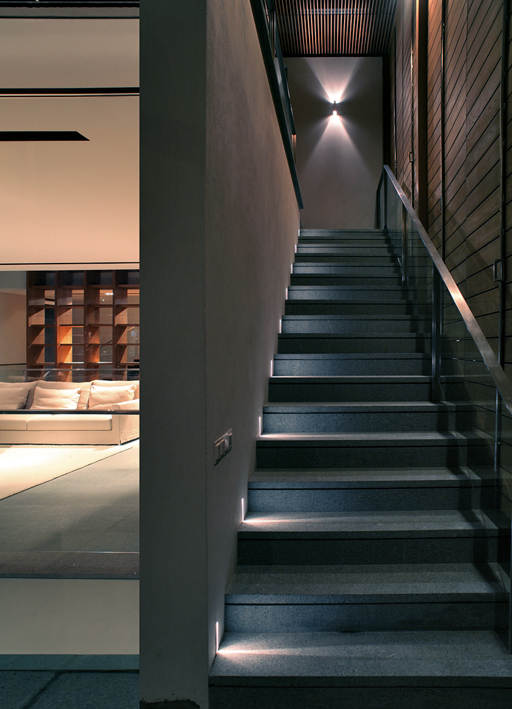 the materials used in the house are a mixture of rustic natural finishes such as the roughly worked rubble walls, naturally finished teak, roughly finished textured plaster walls, as well as highly polished modern materials like stainless steel and glass flooring on the bridges between spaces. just as the spaces within the house are separated from each other with gaps and voids, the junctions between the various materials used in the house are more often divided by grooves, gaps, intermediate layers and recessed channels. the separation of the finishes from each other allows the various materials to exist as independent entities, in a way, to breathe on their own.