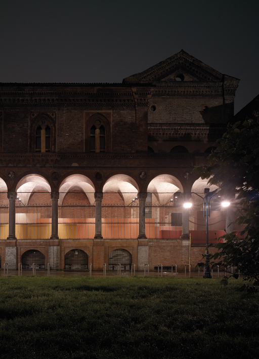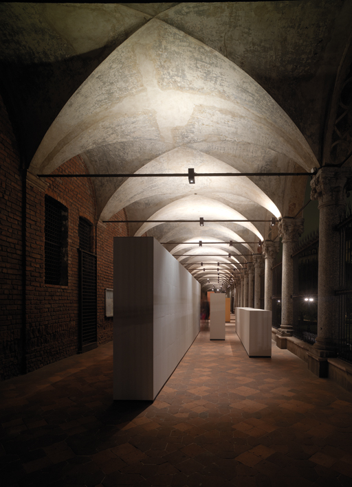 after the success of the first greenenergydesign event, interni returned to the university of milan to stage a major new exhibition dedicated to the concept of energy, seen as a symbolic human resource, presented in the form of sustainable projects and inventions. a series of micro-architectural, experimental and temporary projects was set up in the picturesque setting of the historic ca' granda in milan to stimulate reflection and debate on the use of energy resources and to provide a definition for all those human and inventive energies that materialise in any creative design process. the designers invited by interni to the university, the place par excellence for training future human resources, worked in this spirit on the energy metaphor with a group of companies and with a major contribution from co-producers enel and mini, to create a spectacular event, offering constructive stimuli and ideas to a wide range of public. in this programme, Chipperfield was the architect for the 'quinte a sistema’ project in cooperation with marazzi tecnica and Viabizzuno. a series of eighteen wings of different heights mark out the richini portico lengthwise: the wings, arranged over a length of more than seventy linear metres, are clad using a ceramic system by marazzi tecnica and lit with catena light fittings developed by Viabizzuno, a lighting design that integrates perfectly with the structural chains of the portico, lighting the vaults and architectural massing and putting accent lighting on the wings designed by the architect.
