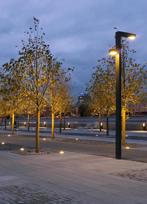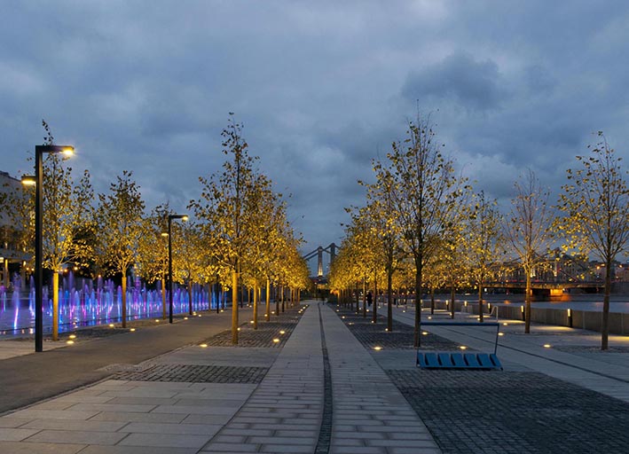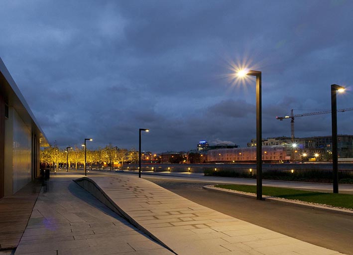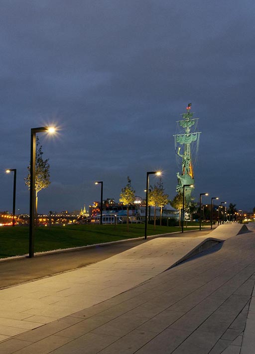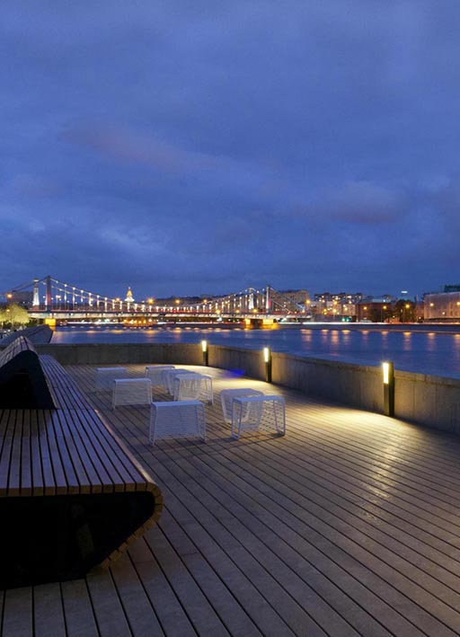 the work of renewing the krymskaya embankment area was part of a larger project aimed at integrating the underdeveloped areas of moscow into city life, in particular revitalising the deserted muzeon park area between the central house of artists and the moskva river. extending from the northern perimeter of gorky park, the krymskaya embankment project creates pedestrian pathways and cycle paths along the south bank of the river, transforming a four lane road into new point of reference for the city, with rows of trees, fountains, cafés and artists’ studios. the dominant architectural motif of the project is a wave: the embankment has been equipped with undulating benches, and undulating paths and cycle paths that create an artificial panorama in motion. this multi-level undulating surface can be used for walking, cycling or roller skating during the summer, while in the winter it is the ideal place to go for sledging, skating or skiing. for design purposes, the area of the park was divided into a number of sections. the bridge area, the artists zone round a 'vernissage' pavilion, the fountain square and the 'green hills'. a stage and two wooden amphitheatres have been built in the area that links gorky park with the krymsky embankment. 28 metal benches, illuminated from within, are spread out along the road enabling pedestrians and cyclists moving between the muzeon and gorky park to take a breather. the entrance to the muzeon is a wooden space of 210 metres with an undulating ceiling, dedicated to vernissages: this imposing structure acts as a transit area from gorky park to the main zone of the embankment, a meeting point for visitors to both of the parks. the fountain area is the central element of the new park and faces the central house of artists, being separated from the river by an avenue of lime trees. this is a 'dry' fountain that does not have a basin filled with water, but 203 remotely controlled diffusers that have been installed directly in the pavement. the most relaxing areas are to be found in the easternmost parts of the embankment, where the focus has been on the creation of an artificial landscape and reforestation. the hillocks, designed for walking, relaxing and admiring the view, have been planted with ornamental plants and those typical of the steppes, such as lime trees, hawthorn, rowan trees and ornamental apple trees. finally, three pavilions have been built on the embankment. all feature the extensive use of glass, a material that was fairly common during the era of the former soviet union. to make the park accessible and attractive 24 hours a day, a particular attention has been paid to the design of light in urban space: an accent light on some details that also works as a company light along the path. the cubo paletto lamps pick out the entire balustrade of the embankment, giving a striking visual impact. all the tracks, instead, are lit by means of giraeFFe lamp posts that guide pedestrians and cyclists offering an optimal security and service light for sport activities; in the square, the dry fountain, together with the avenue of lime trees, creates a luminous composition that combines the dynamic colouring of the lighting of the jets with the more suffused white lighting that traces the avenue of lime trees. in the renovation of this space, light becomes a fundamental design element, both in a compositional and functional point of view: the light for the city is not only a service, but also a joy and life source, symbol of cohesion, occasion for sharing common areas to the rediscovery of peaceful and exciting social relations.
